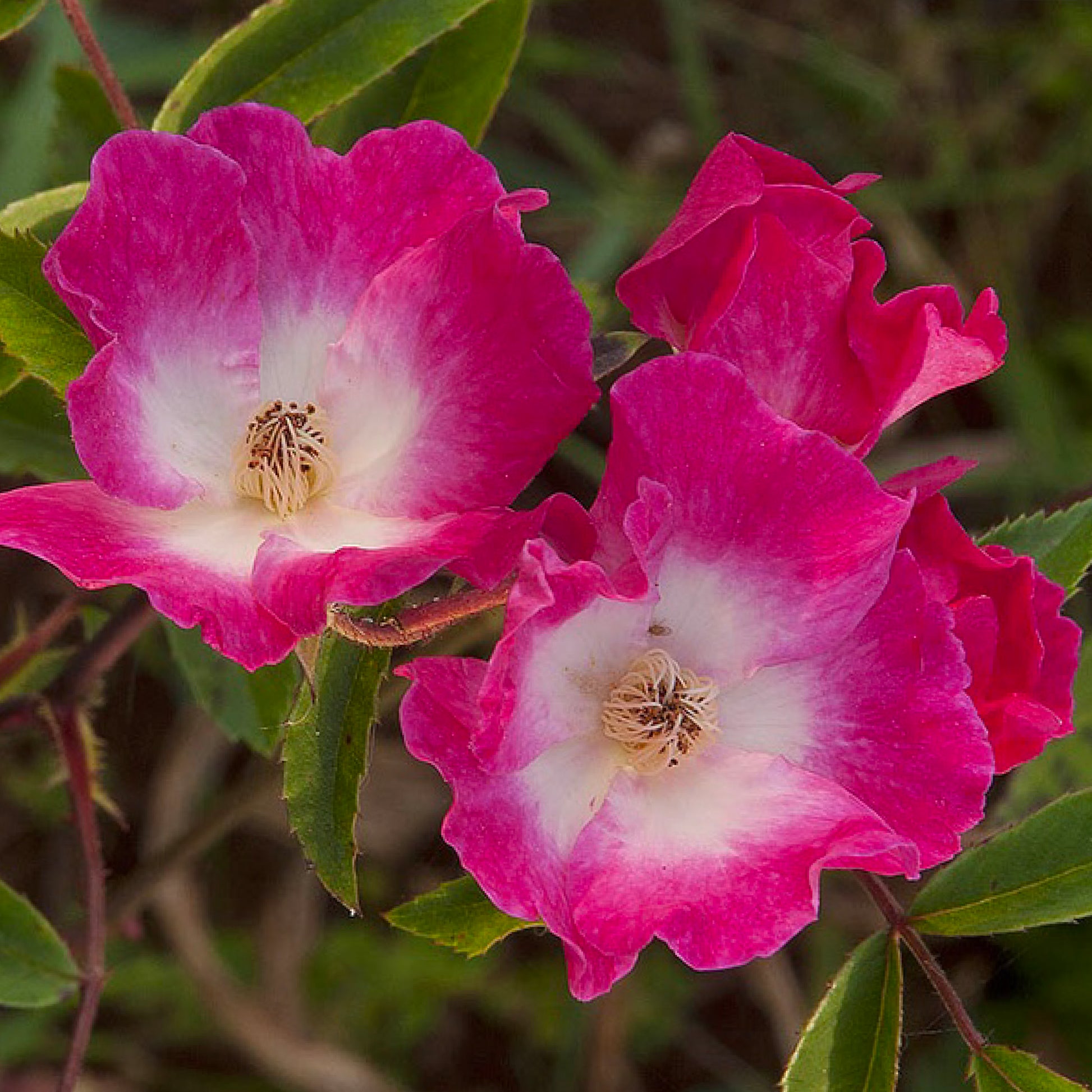 Large clusters of medium, single, cherry pink flowers with white eyes and yellow / white stamens