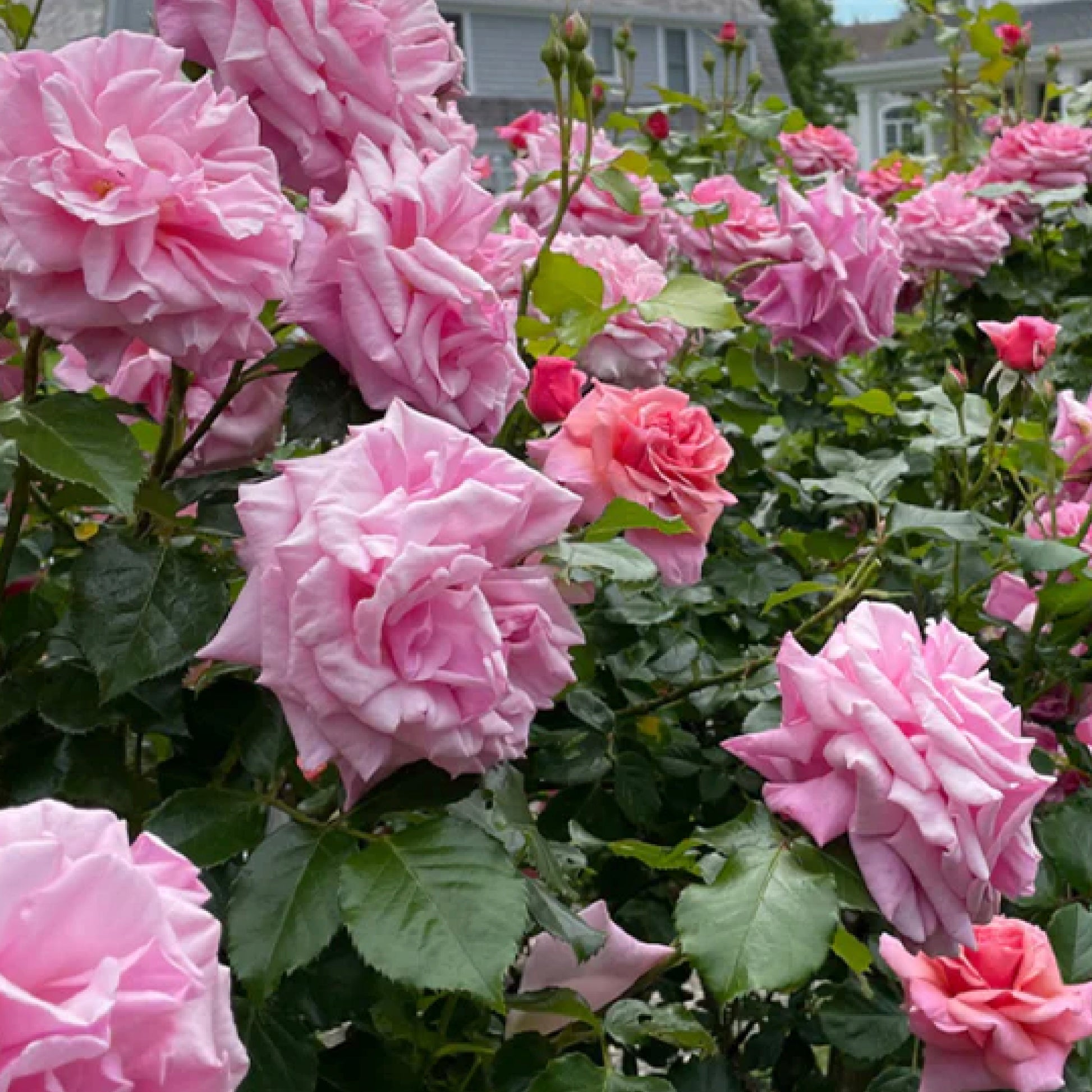 Small clusters of very double, deeply cupped, large, rose-pink flowers with shades of apricot, red and magenta