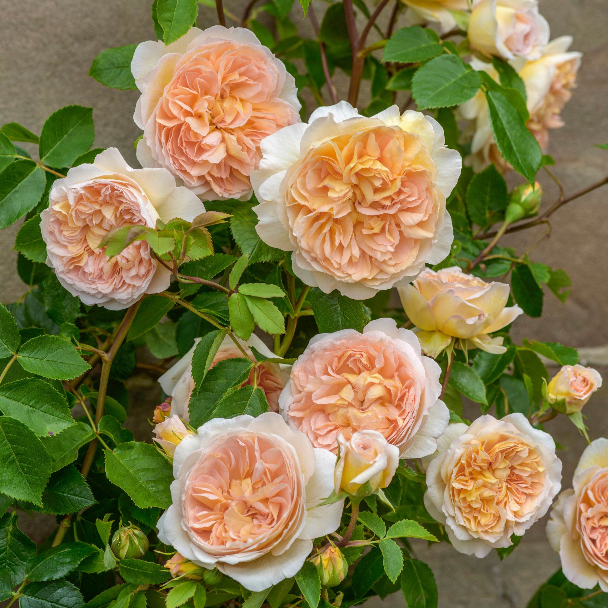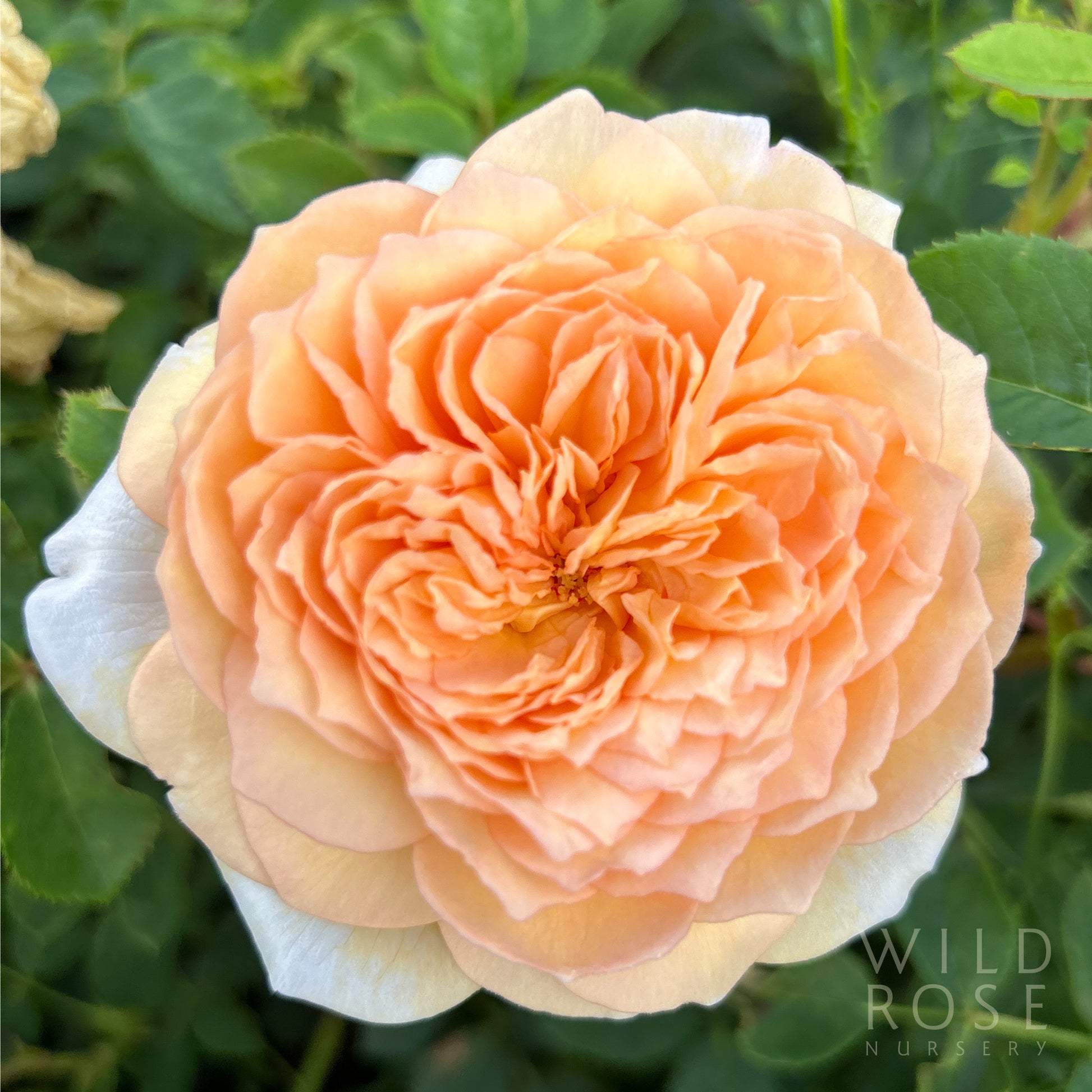 Large, very double, cupped, rosette, soft pink / apricot yellow flowers with creamy outer petals