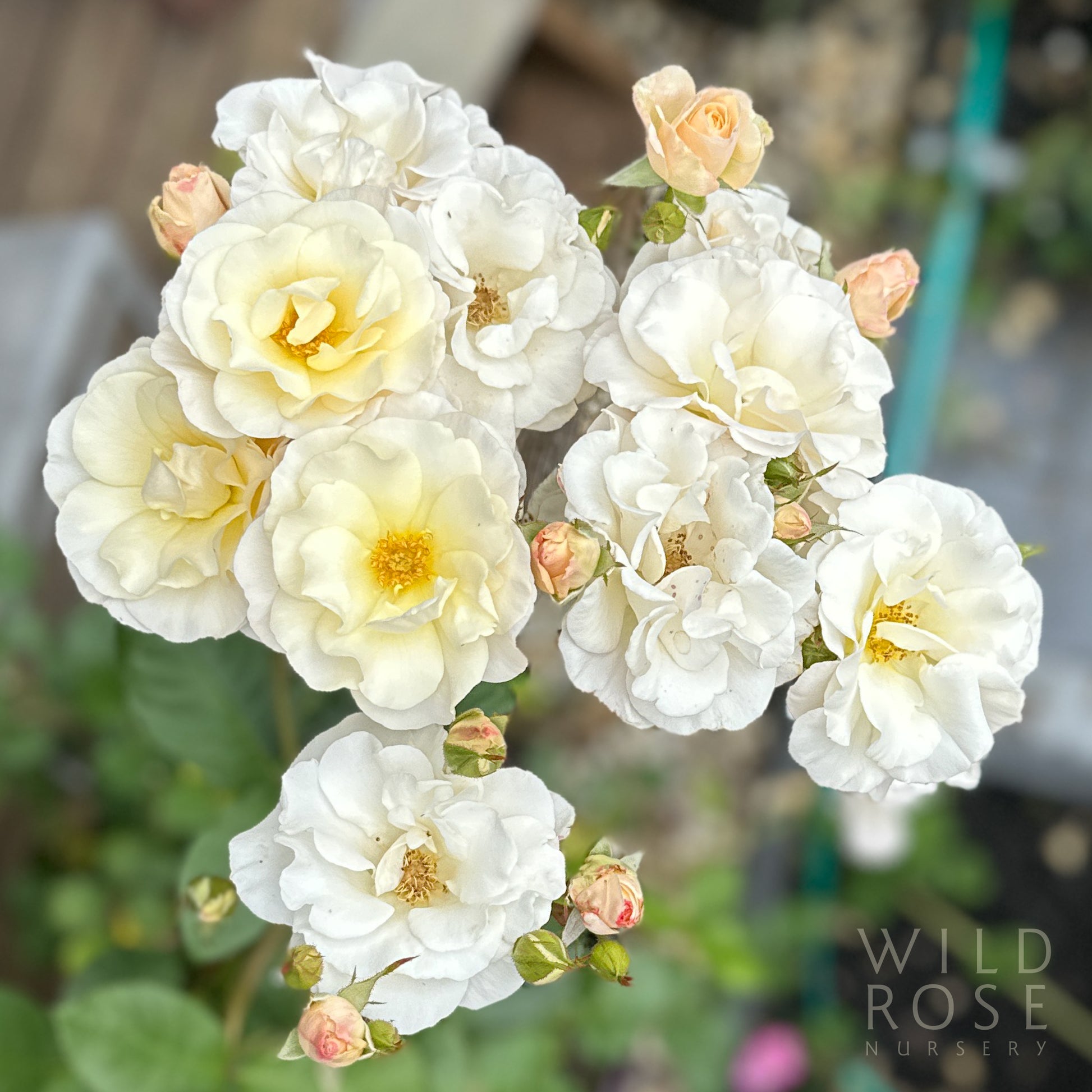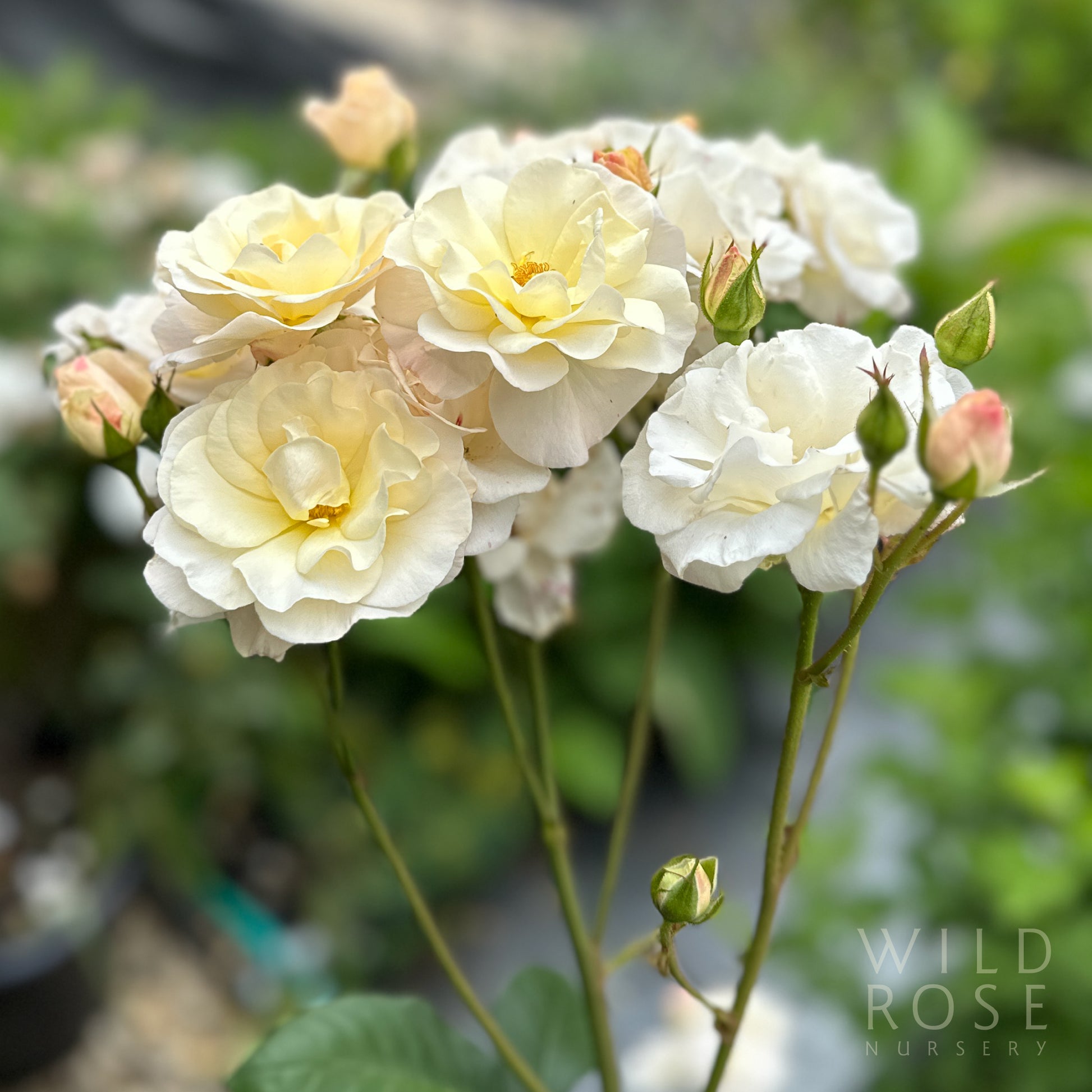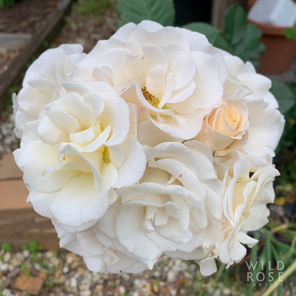 Small clusters of medium, semi-double, creamy white flower with pink buds