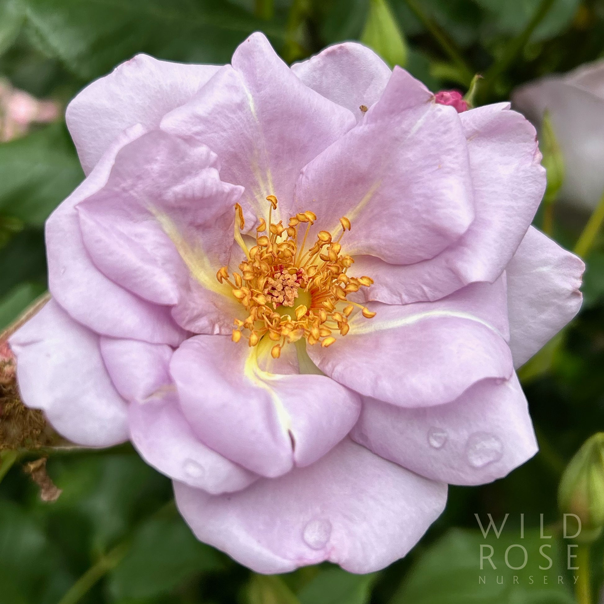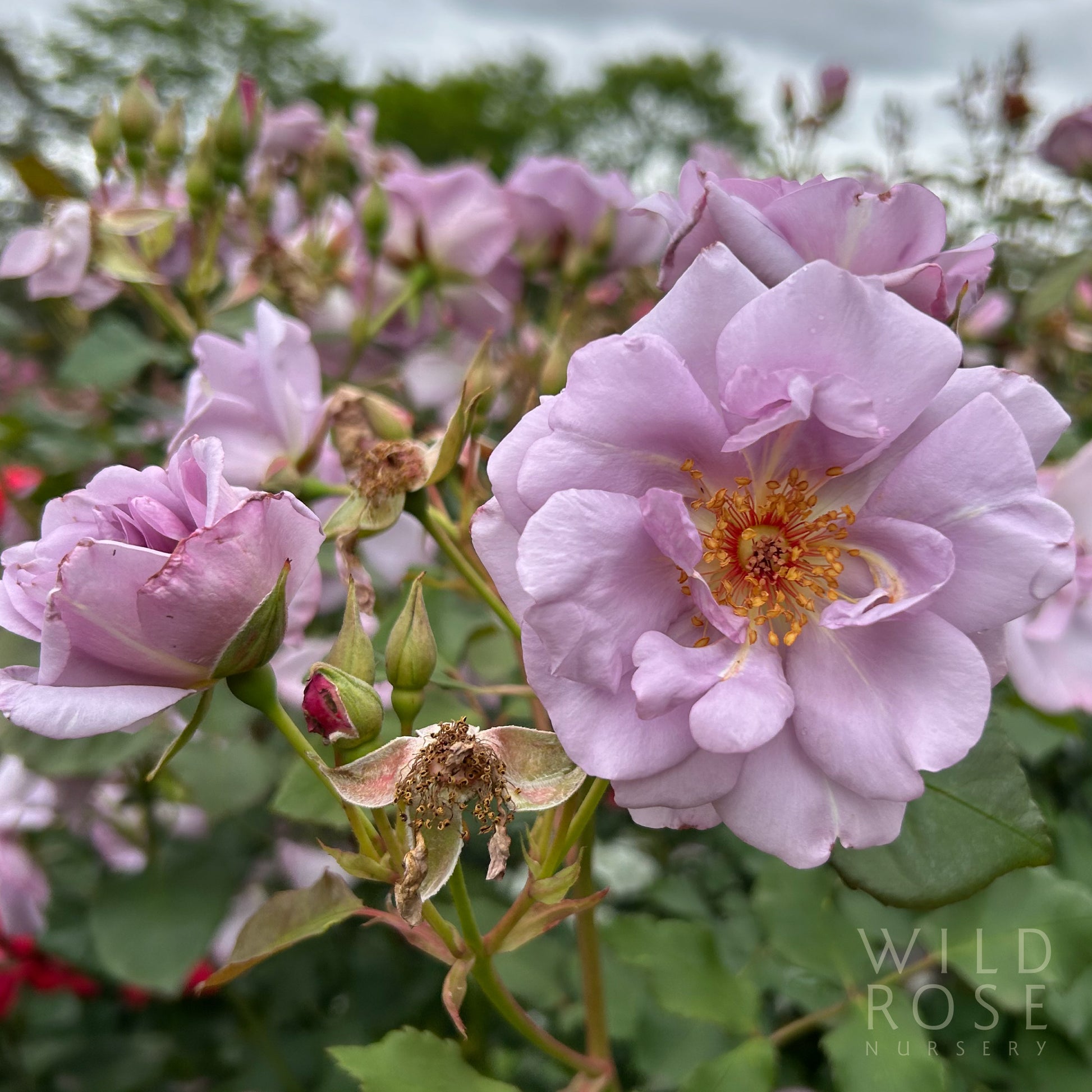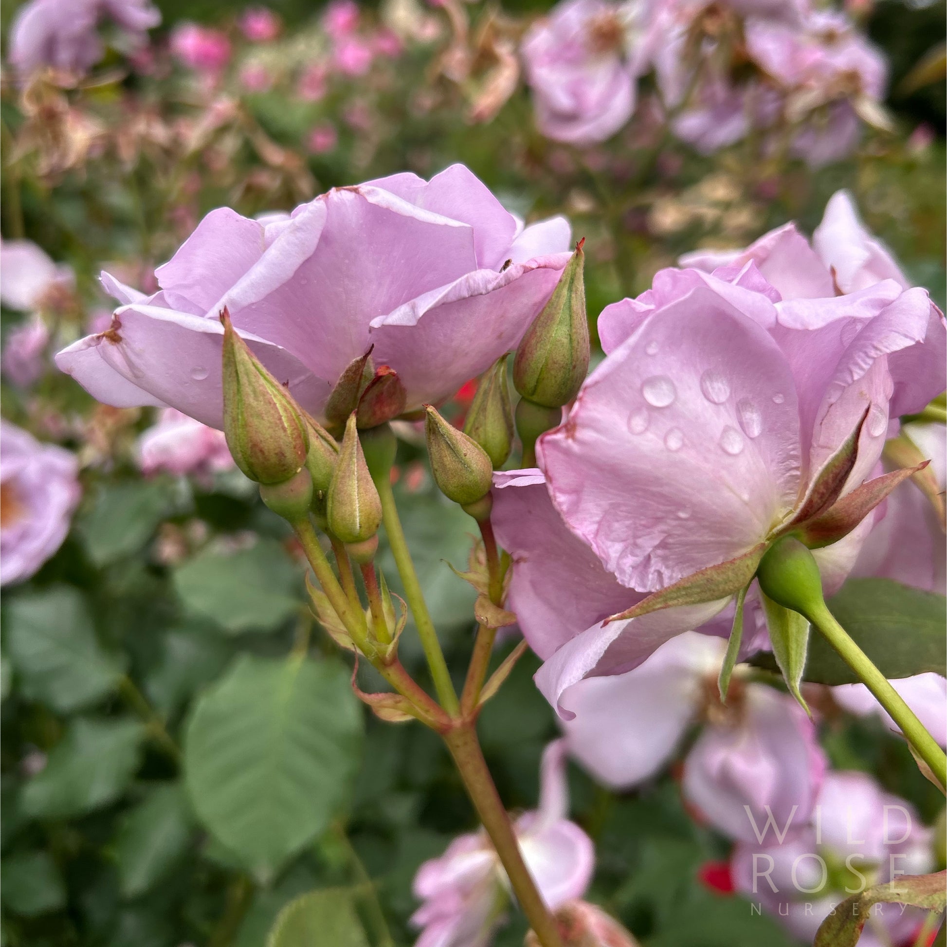 Small clusters of medium, semi-double, flat, lavender flowers with reddish mauve buds