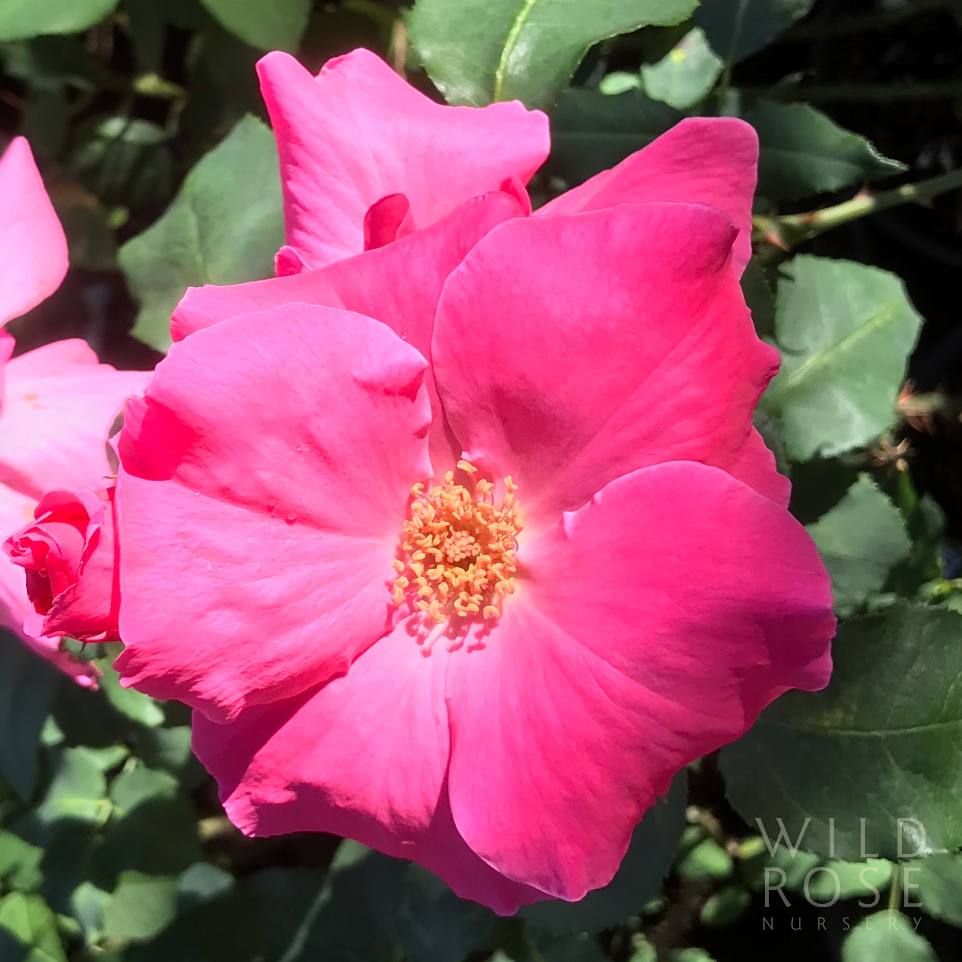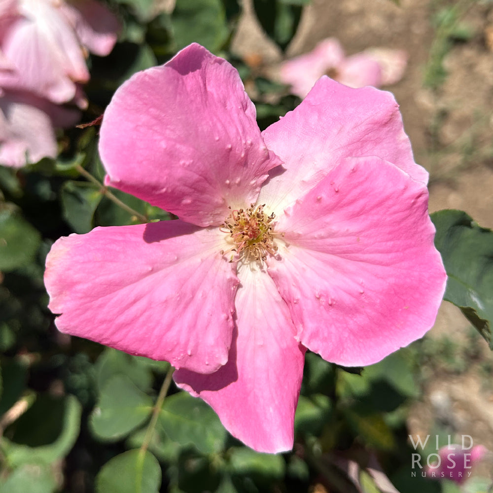 Large, single, flat, borne mostly solitary, cherry-pink flowers with white centres and golden-yellow stamens