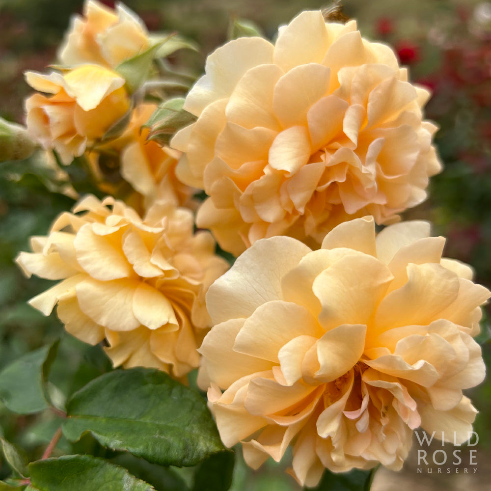 Small clusters of medium, fully double to very full, warm apricot to buff flowers, fading to cream