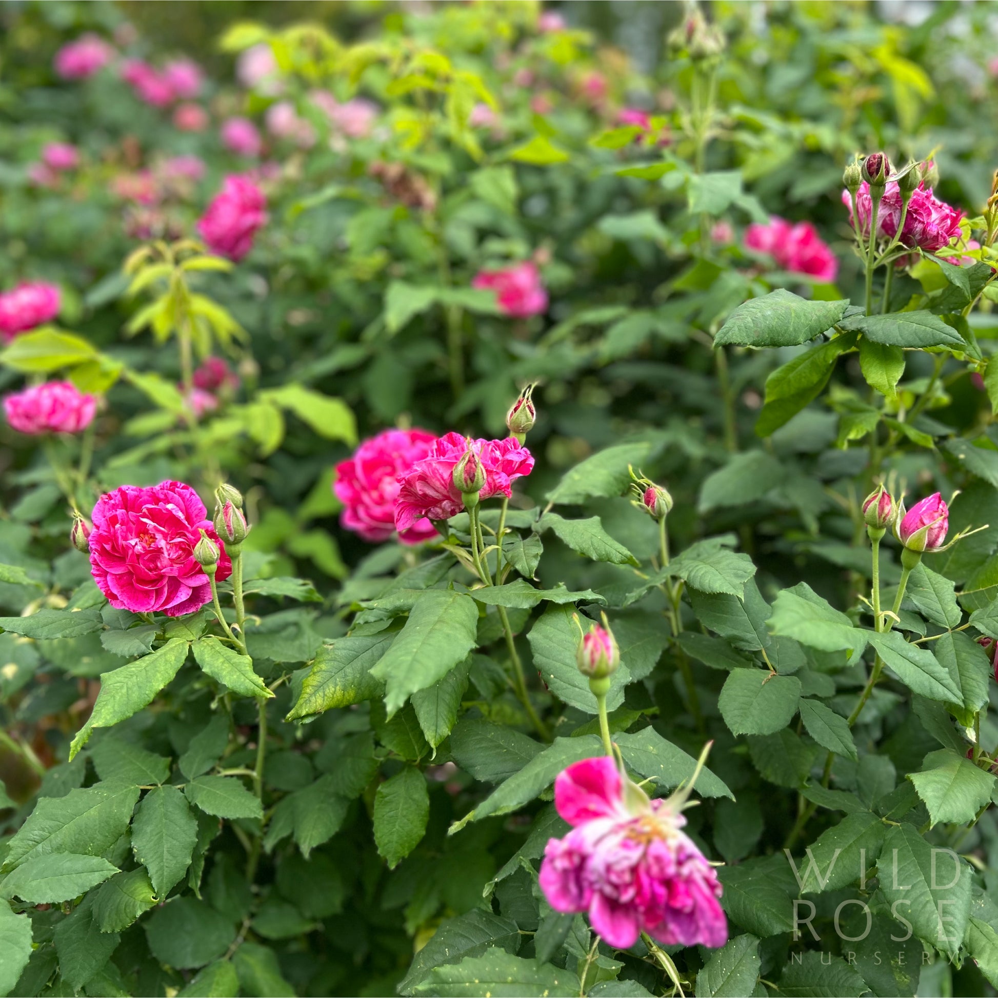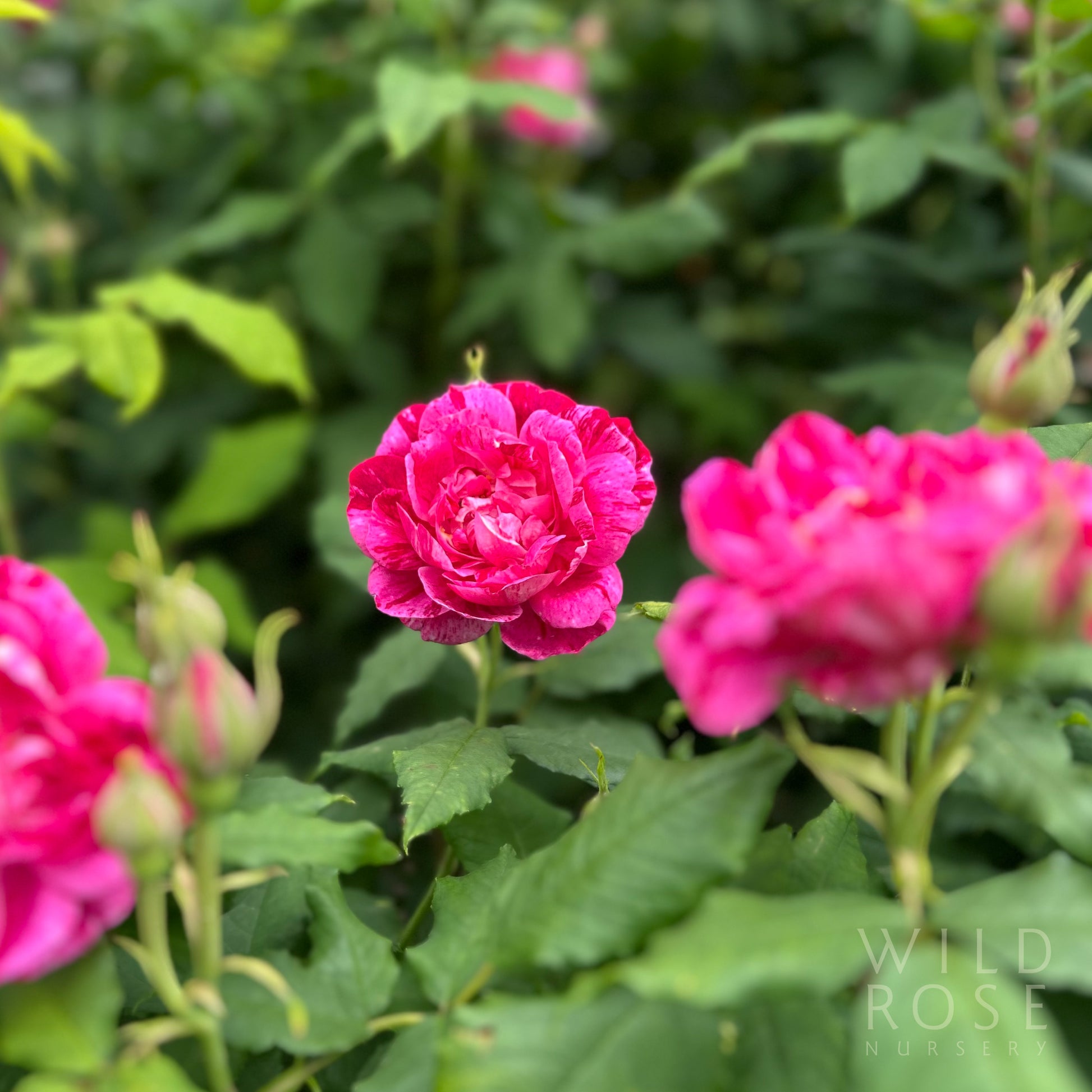 Clusters of medium to large, double, cupped, globular, intense crimson flowers marbled with with deep pink, purple and white