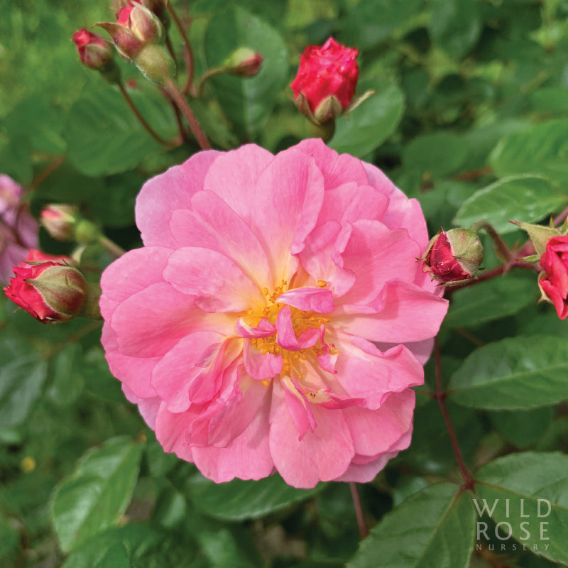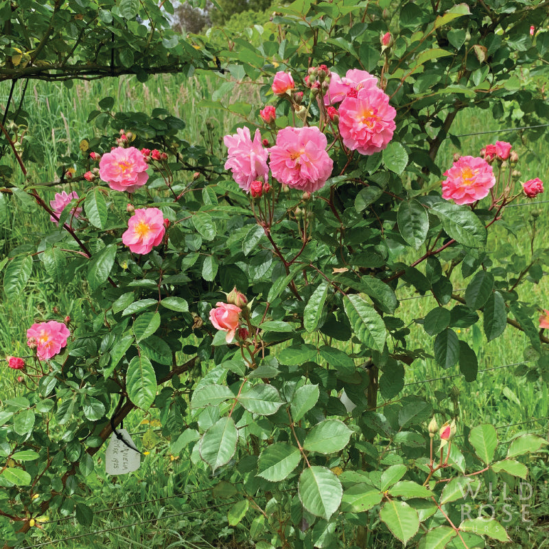 Clusters of medium, very full, rosette, deep-pink flowers with yellow shading and ageing to light pink