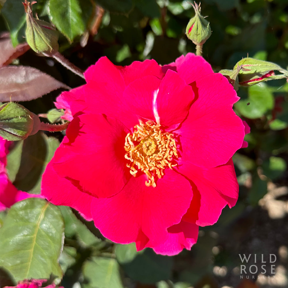 Large, semi-double, deep cherry-red flowers with yellow stamens