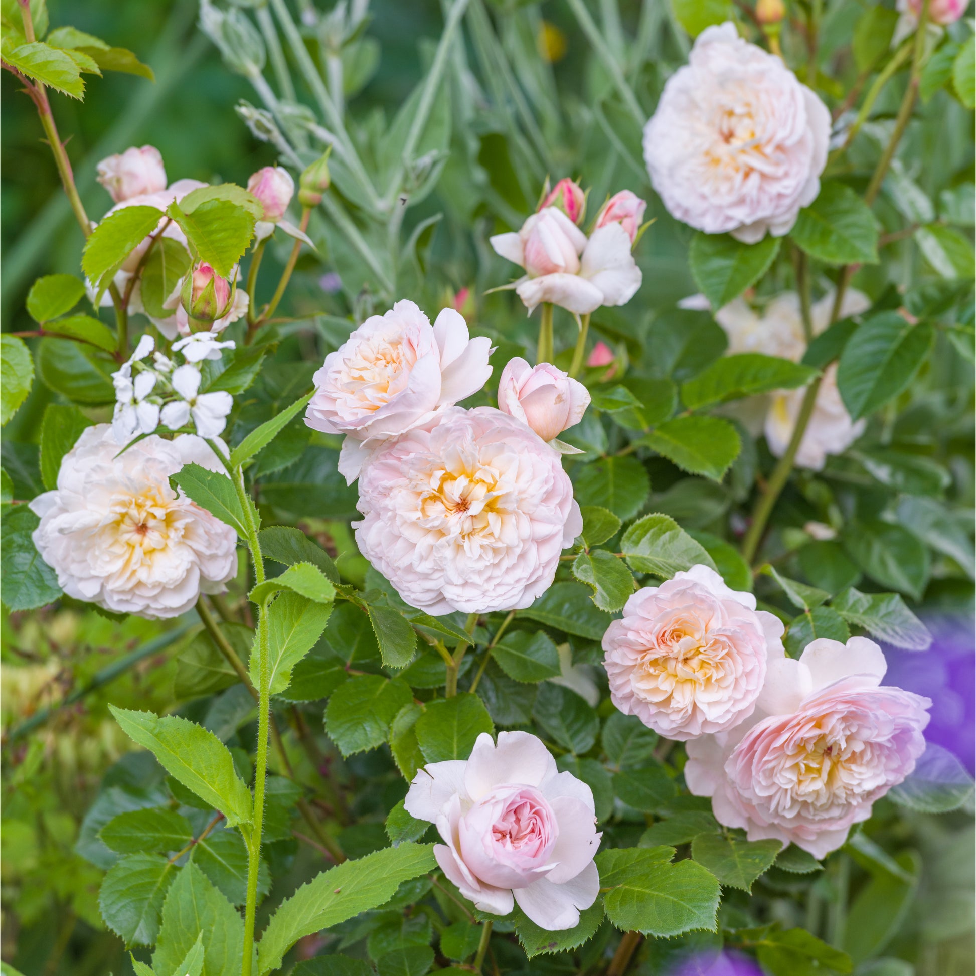 Large, very full, cupped to flat, rosette, button-eyed, light pink and apricot flowers with yellow centre