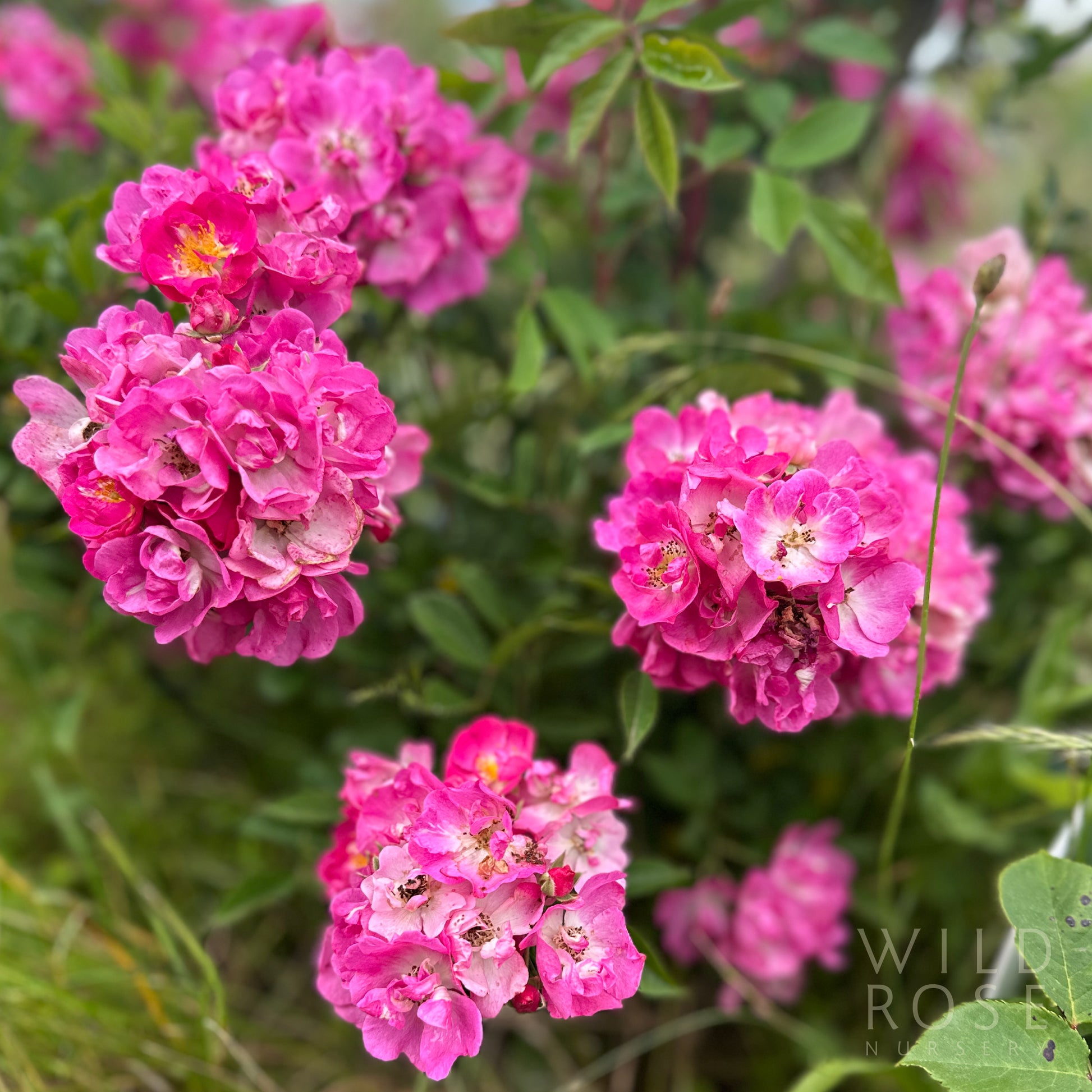 Large clusters of small to medium, fully double, dark carmine pink flowers