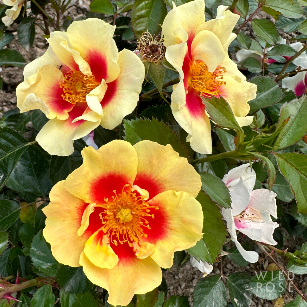Small clusters of medium, single, borne mostly solitary, light yellow flowers with red fading eyes and orange shading and ovoid buds