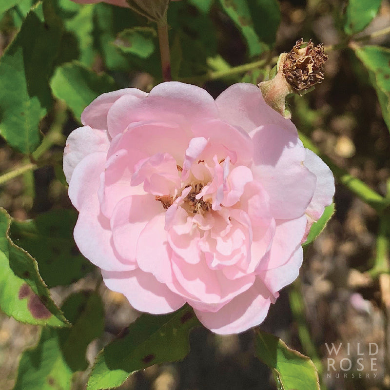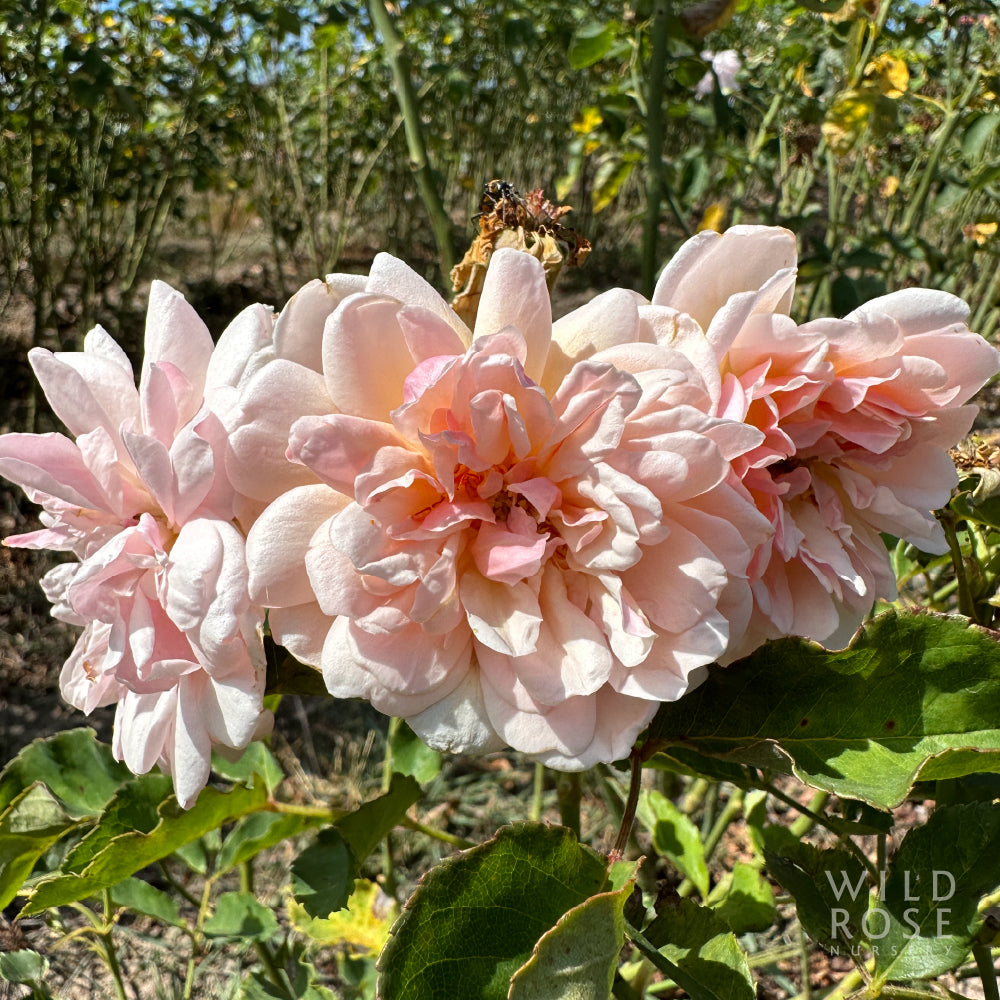 Large clusters of semi-double, flat, informal, rosette-shaped, silvery pink to salmon flowers deepening in colour towards the centre