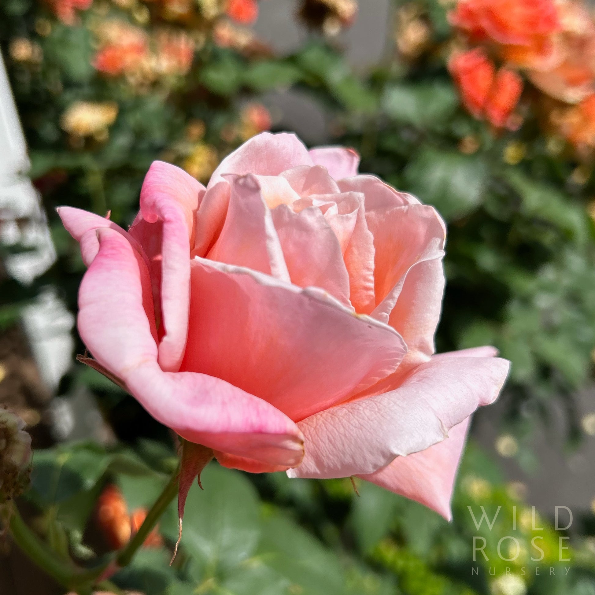 Medium, very double, open, high-centred, borne mostly solitary, rose-pink flowers with deeper shading and long, pointed, ovoid buds