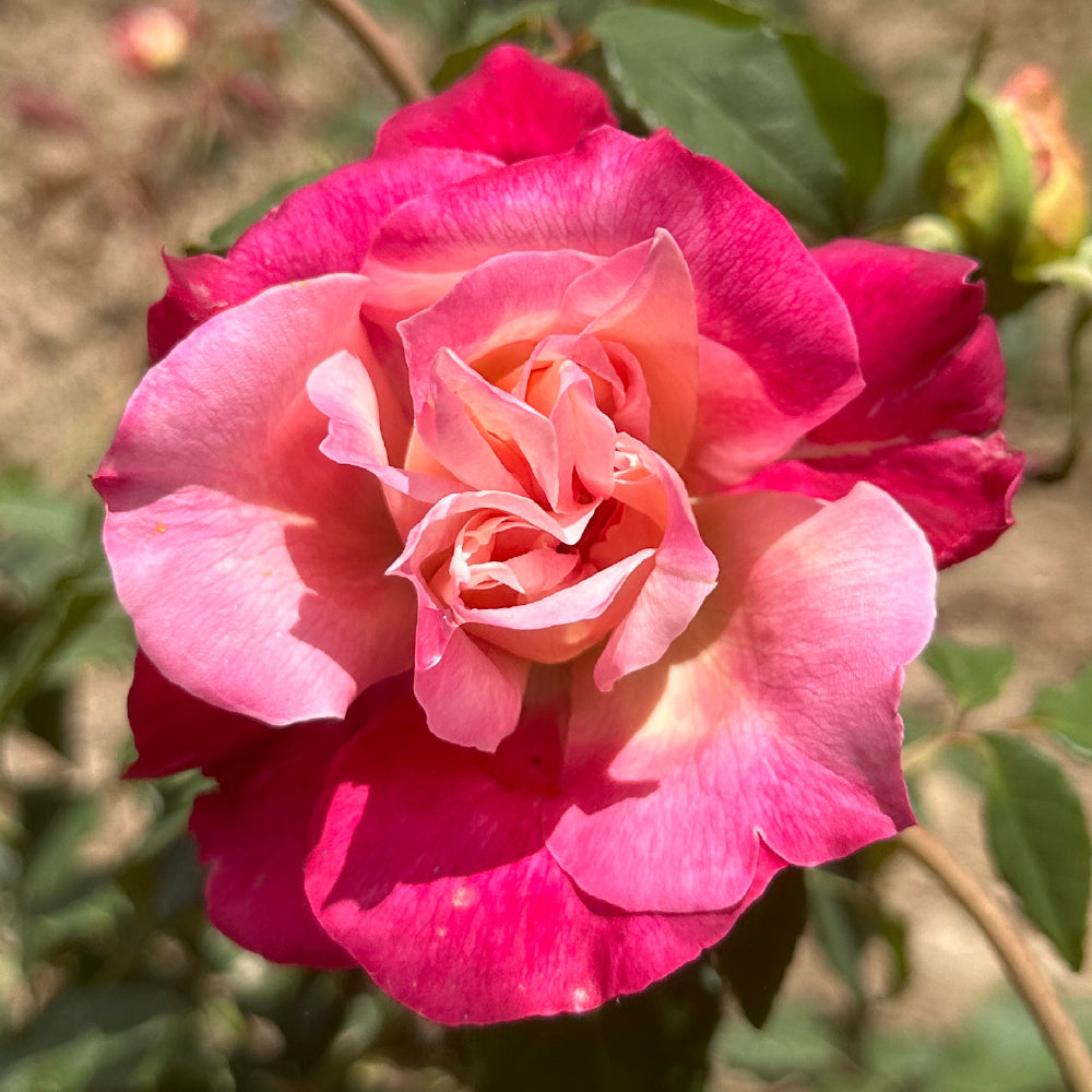 Large, double, cupped, red-pink to cream buff flowers with apricot and magenta shading and golden-yellow centres