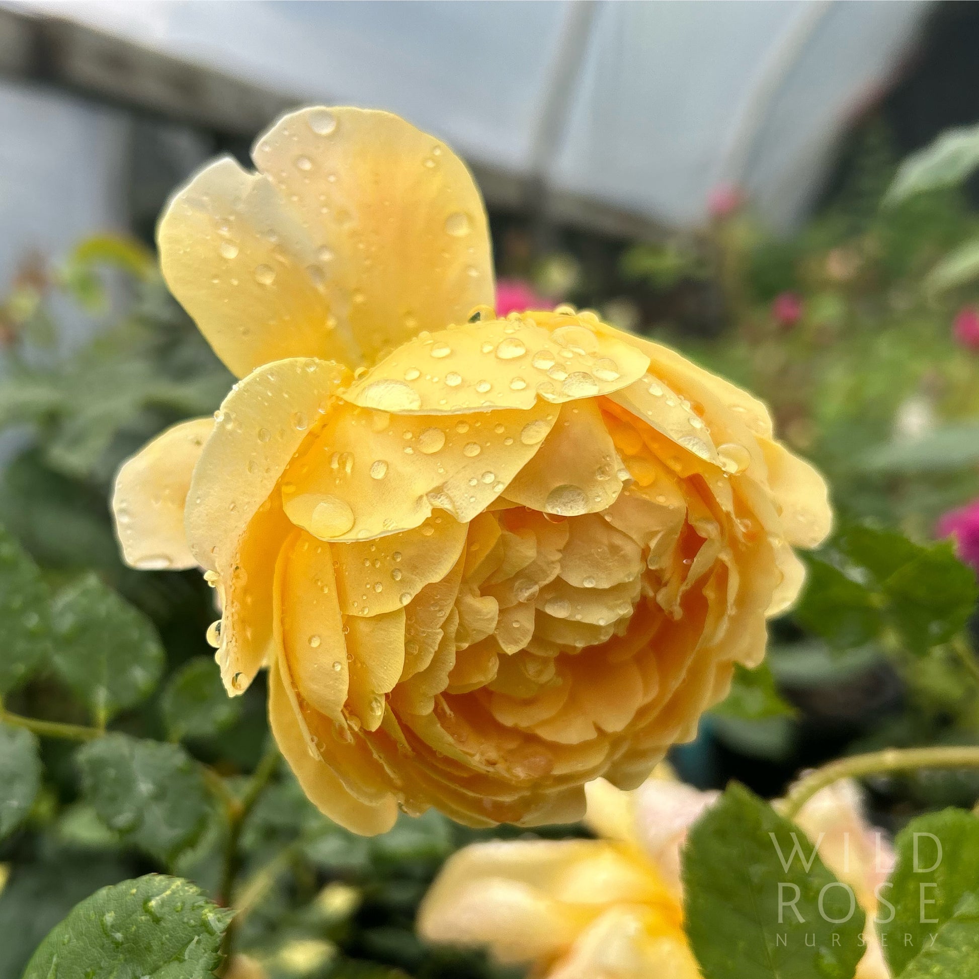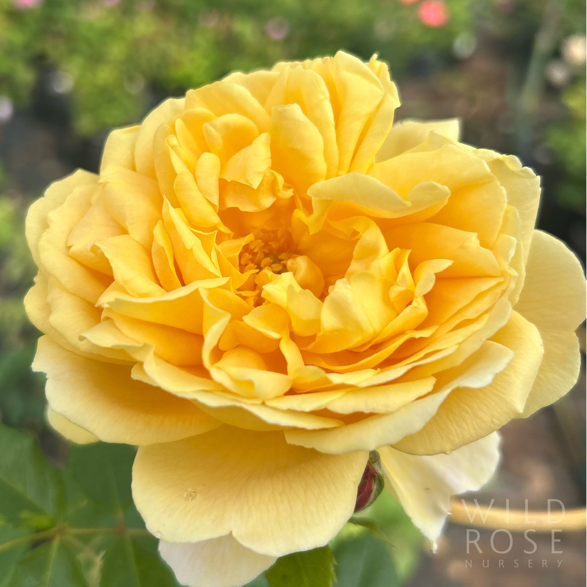 Small clusters of medium, very full, cupped, globular, deep yellow flowers with rounded buds