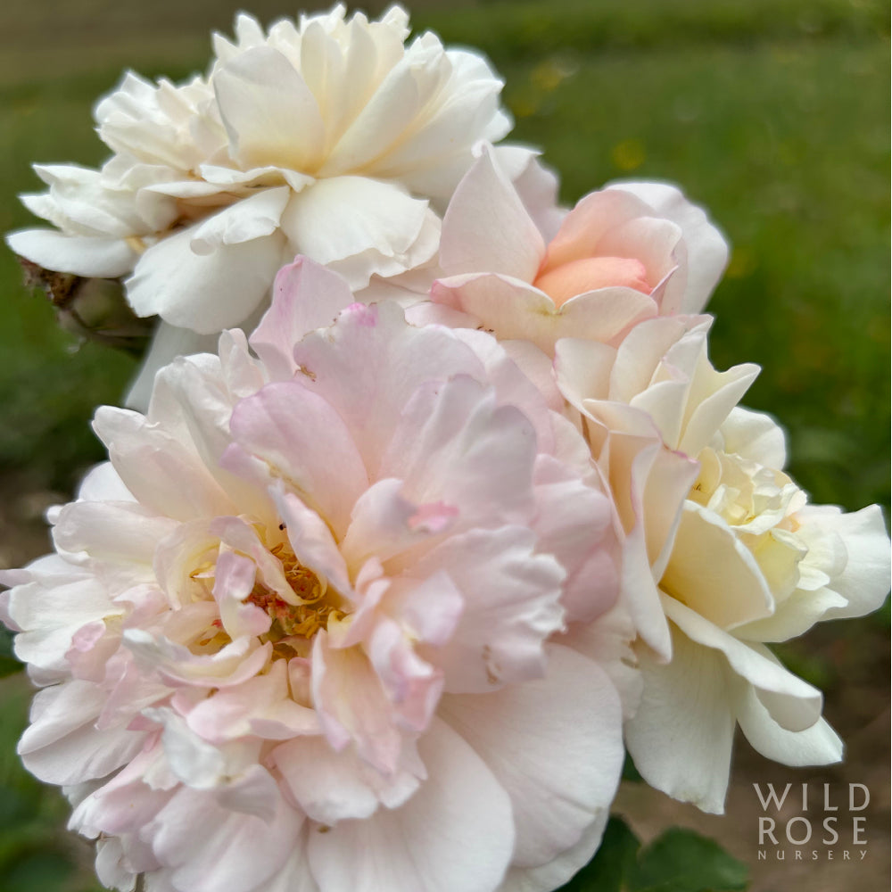 Small clusters of medium to large, double, rosette, pale apricot to salmon-pink flowers with yellow undertones and ageing to cream