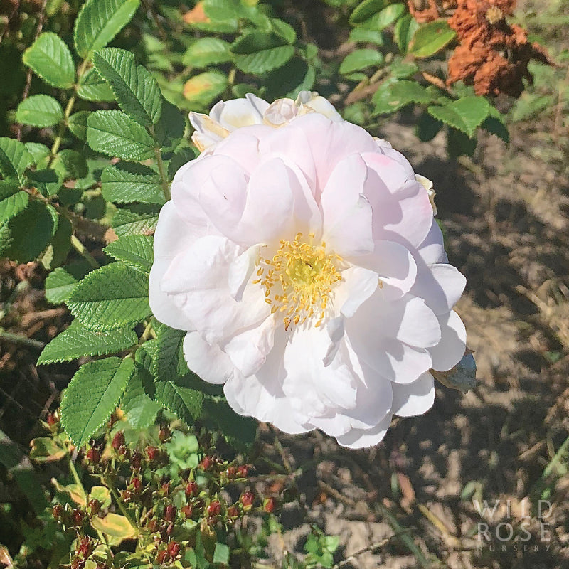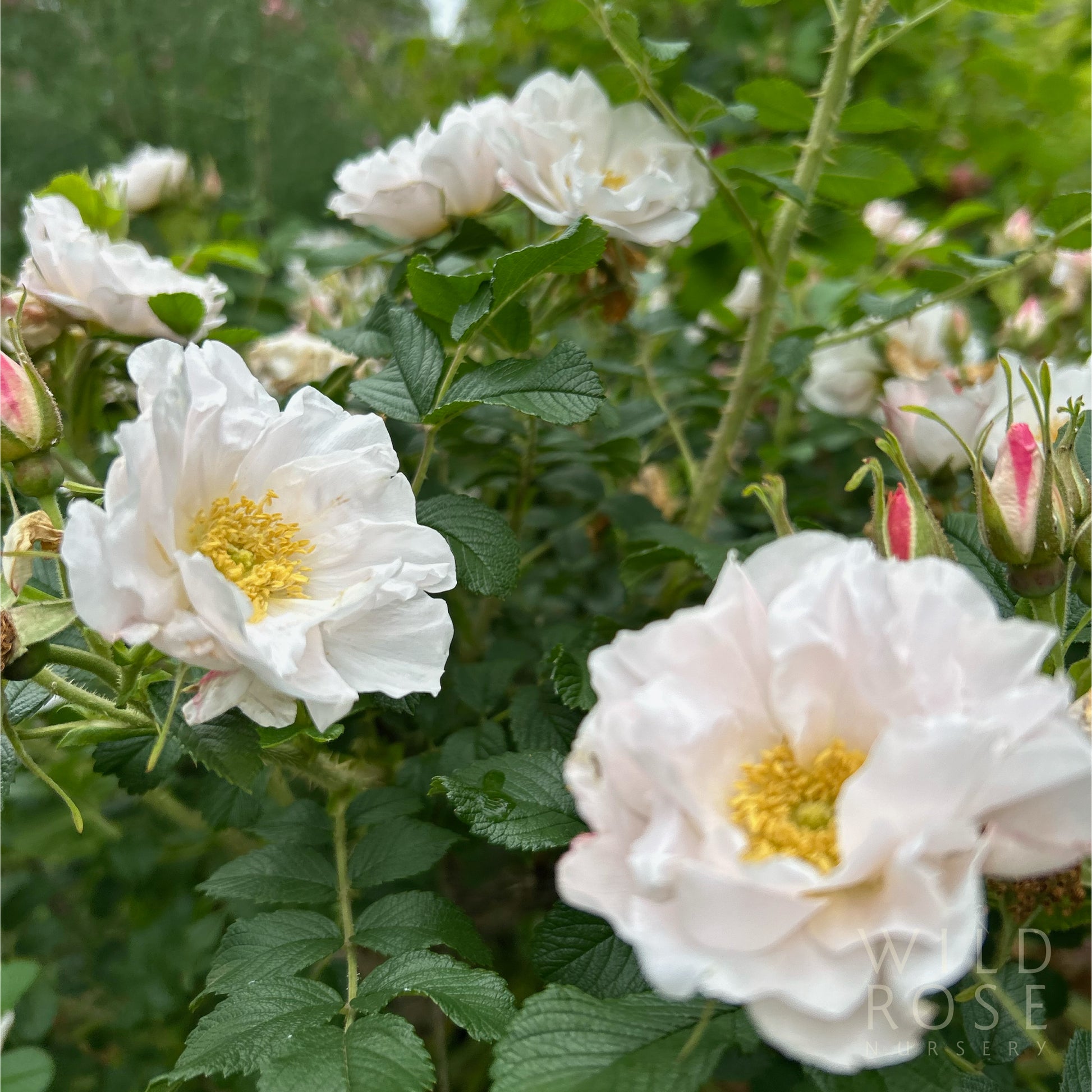 Clusters of medium, semi-double, flat, white flowers with pink shading and yellow stamens and rounded buds