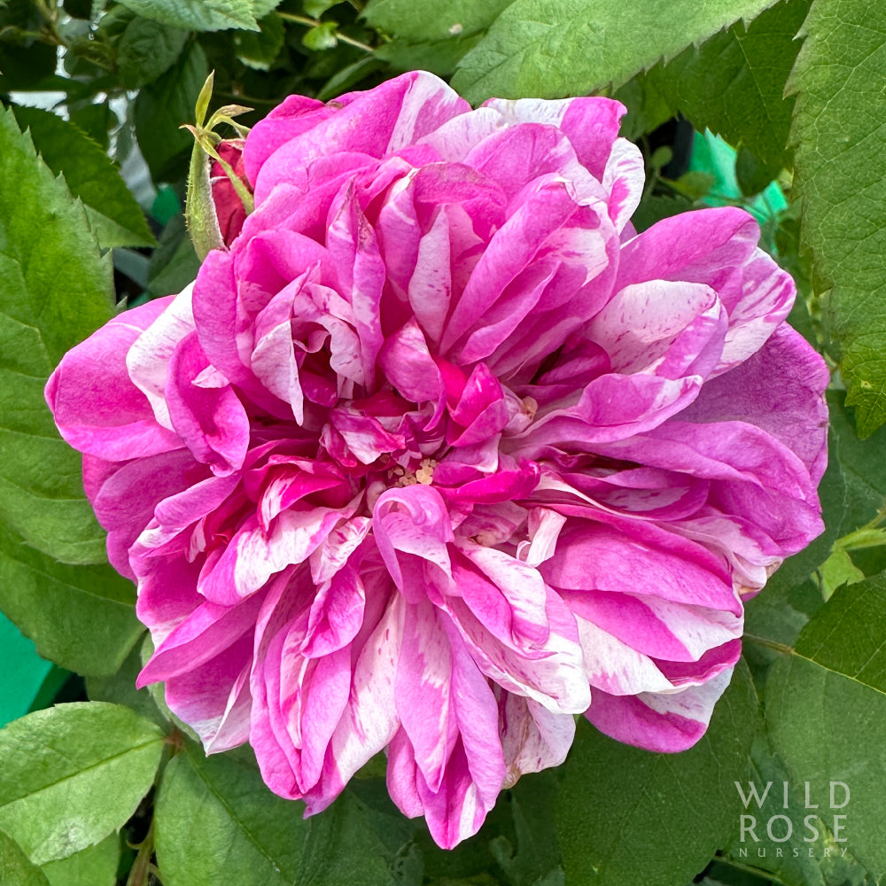 Fully double, shallow-cupped, quartered flowers of pale pink flowers marbled with crimson and purple