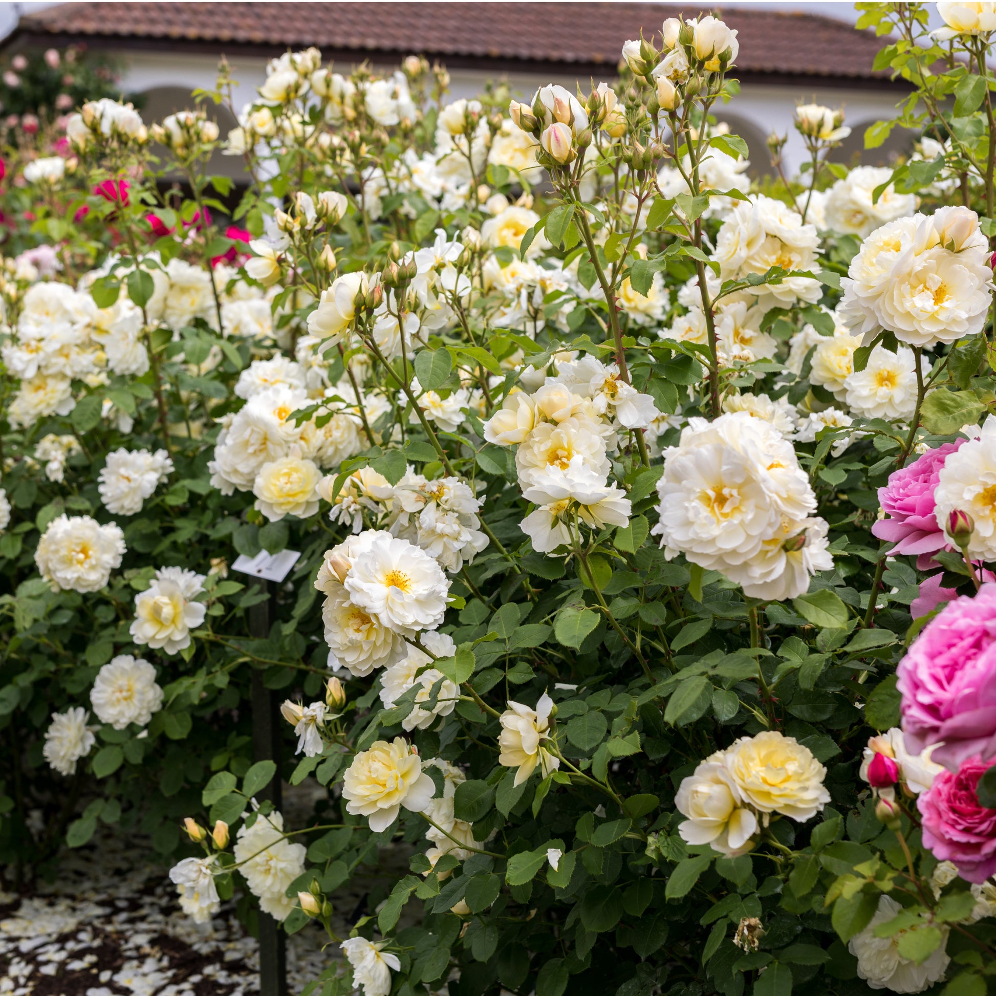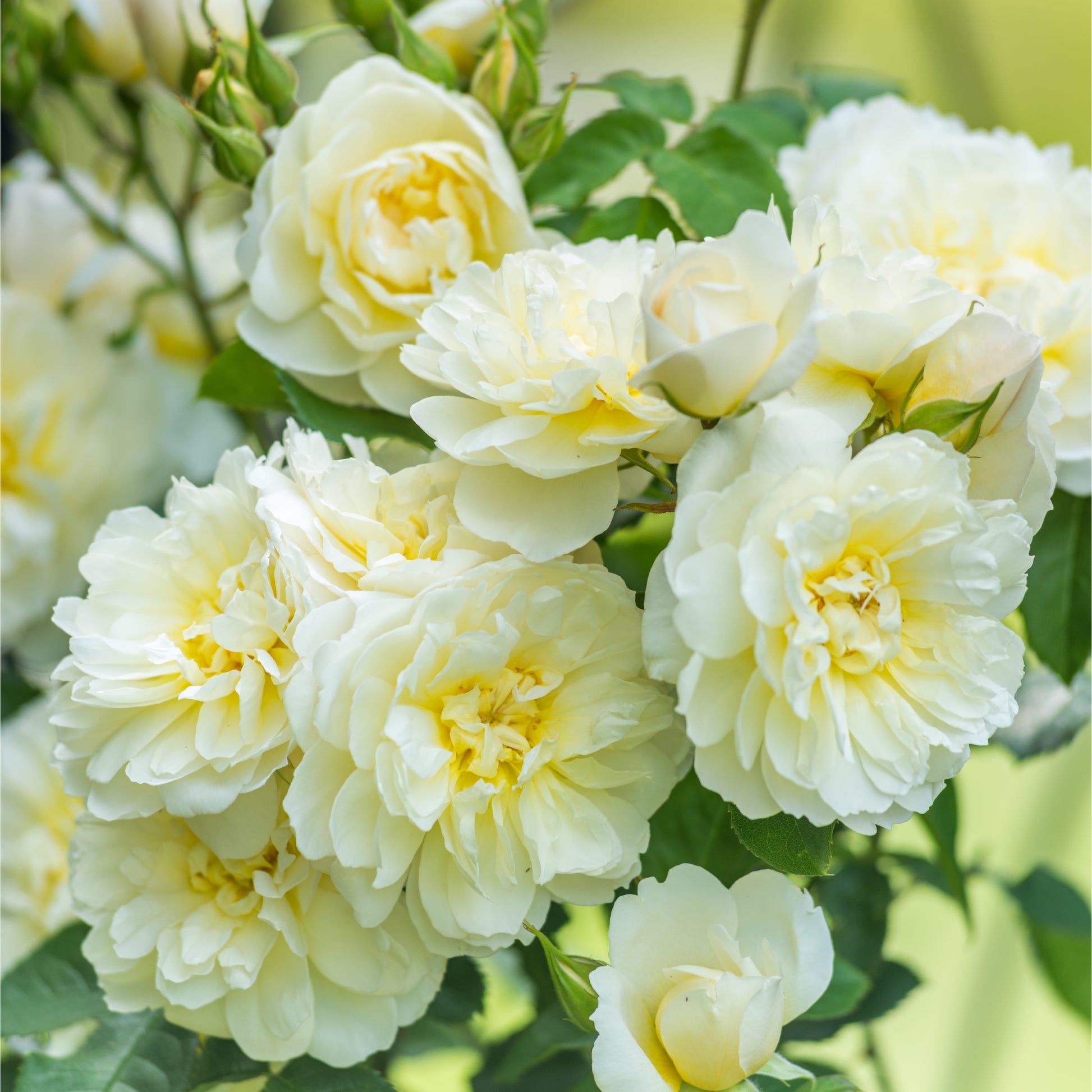 Medium, double lemon-yellow flowers, fading to cream, with a button eye and ruffled petals.