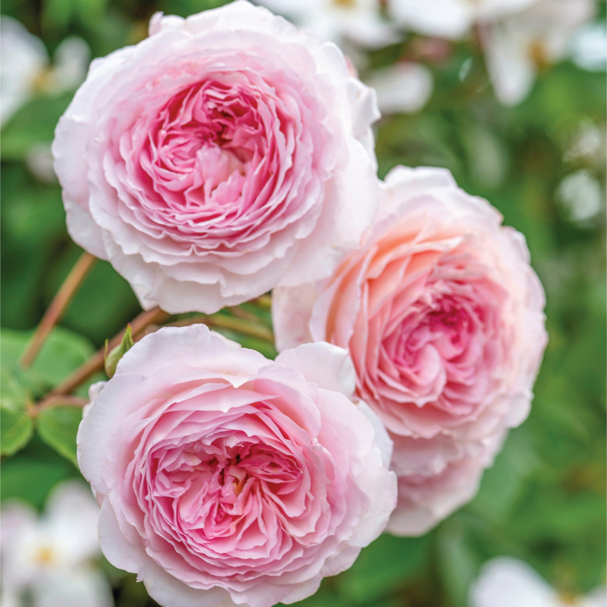 Small clusters of medium, very full, light pink flowers with domed form, fading at the edges