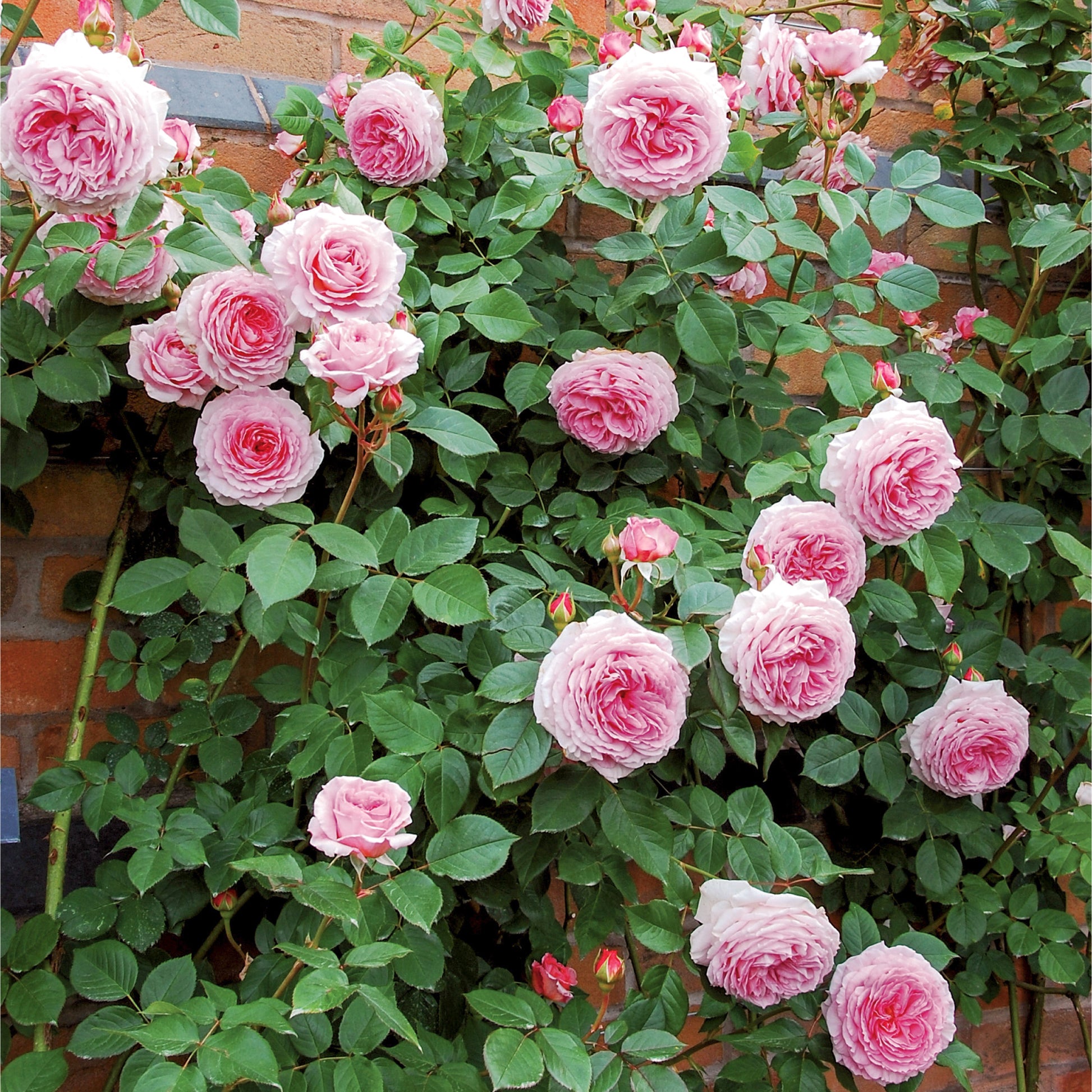 Tall, upright, near-thornless, climbing shrub with semi-glossy foliage