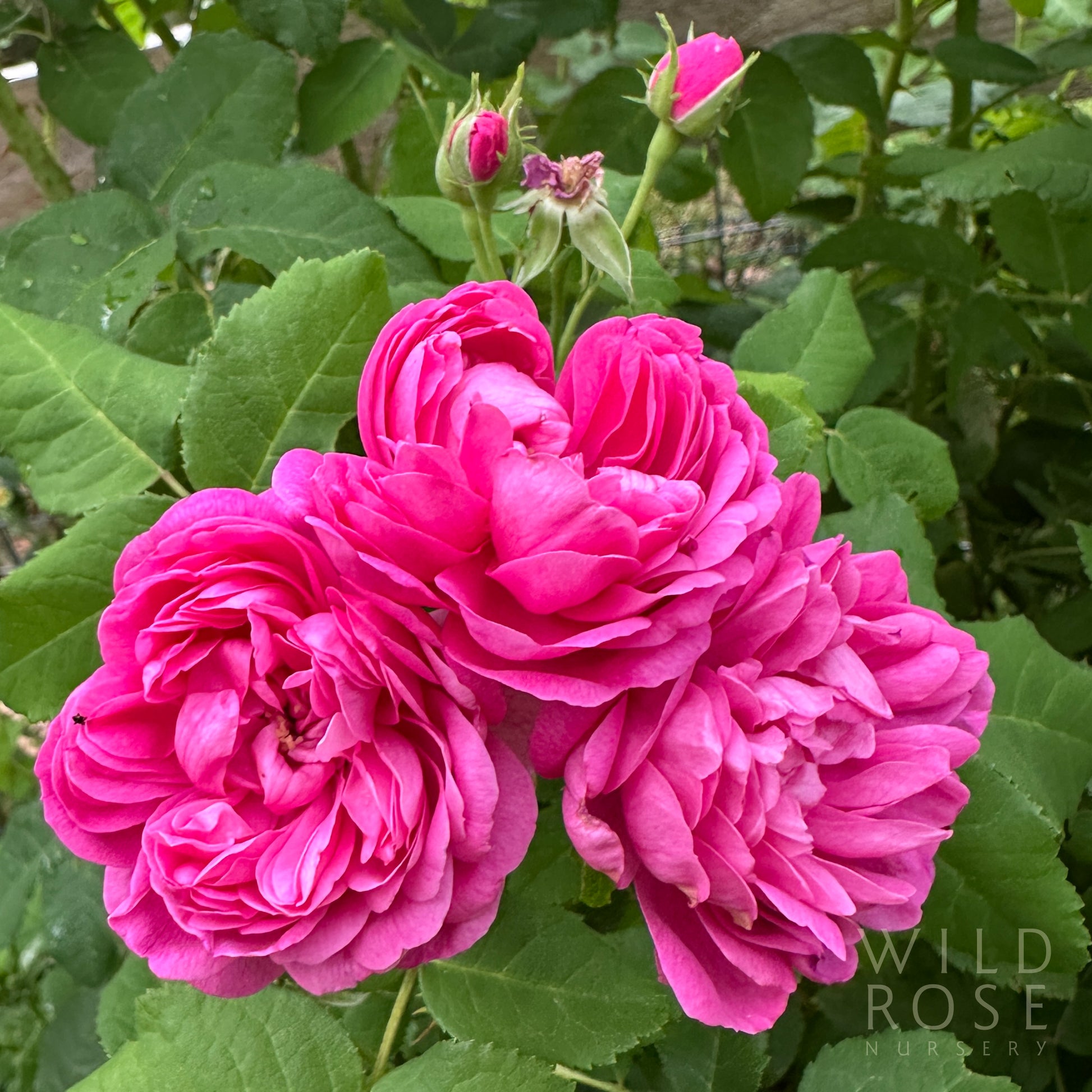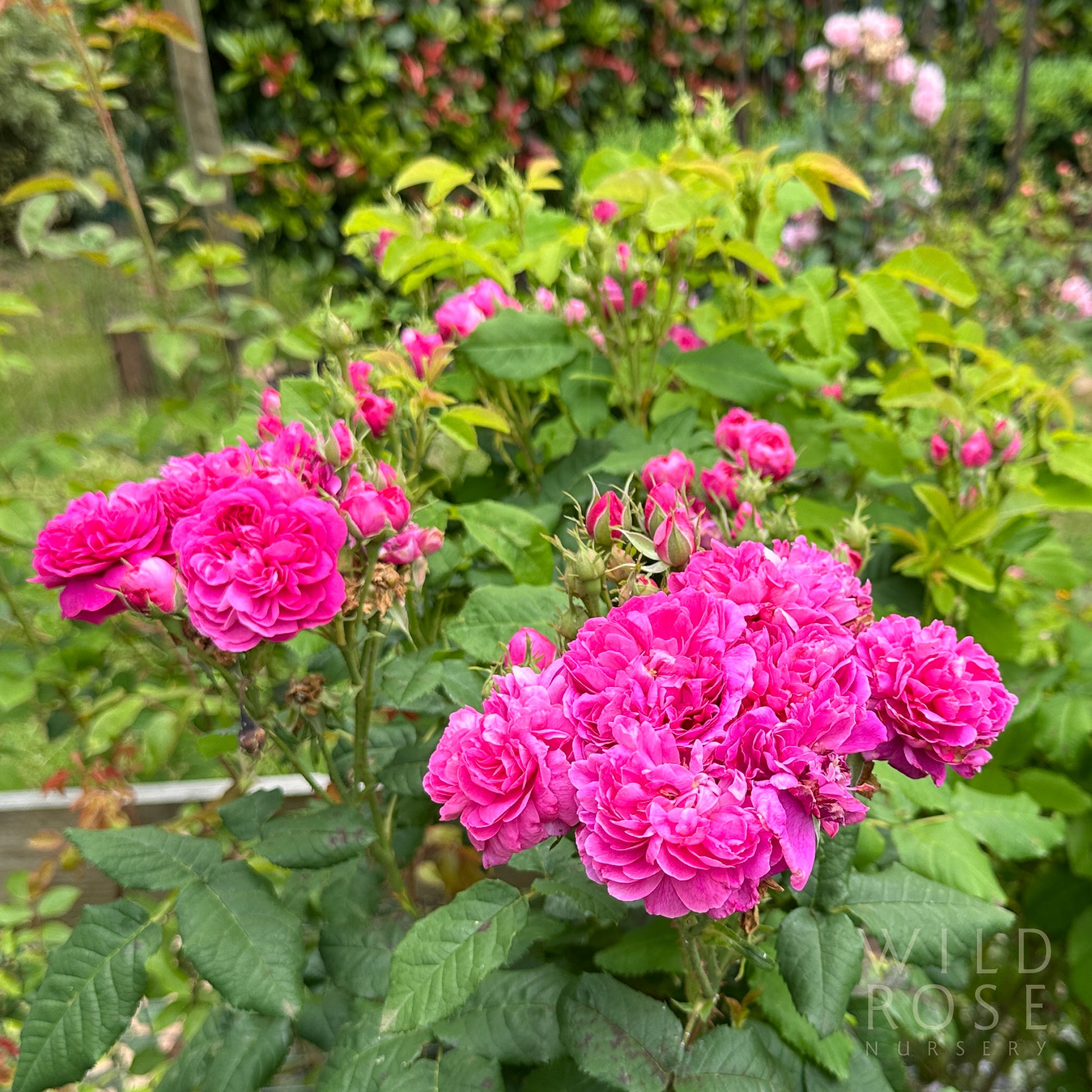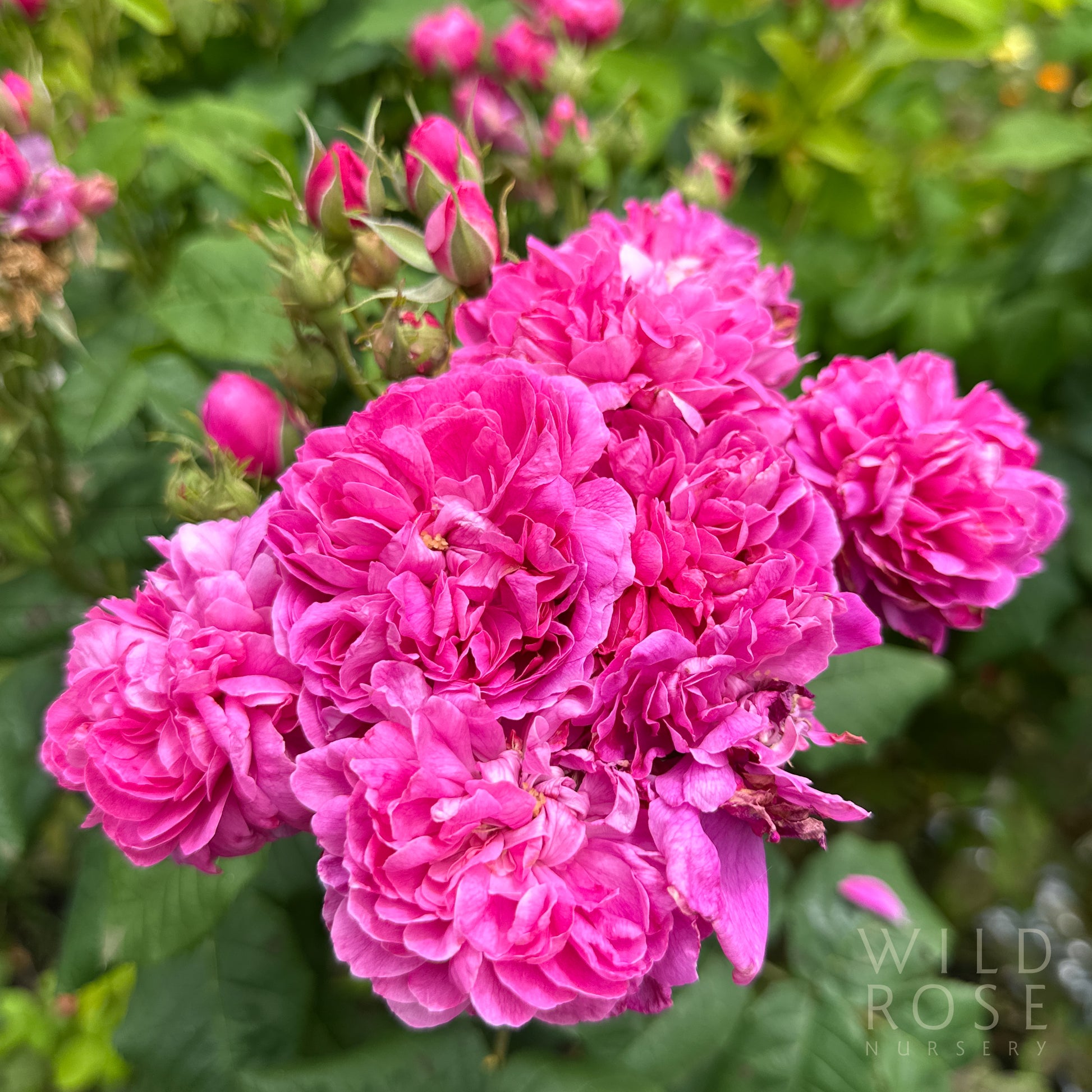 Clusters of medium, full, button-eyed, quarter bloom, deep pink flowers with violet shading