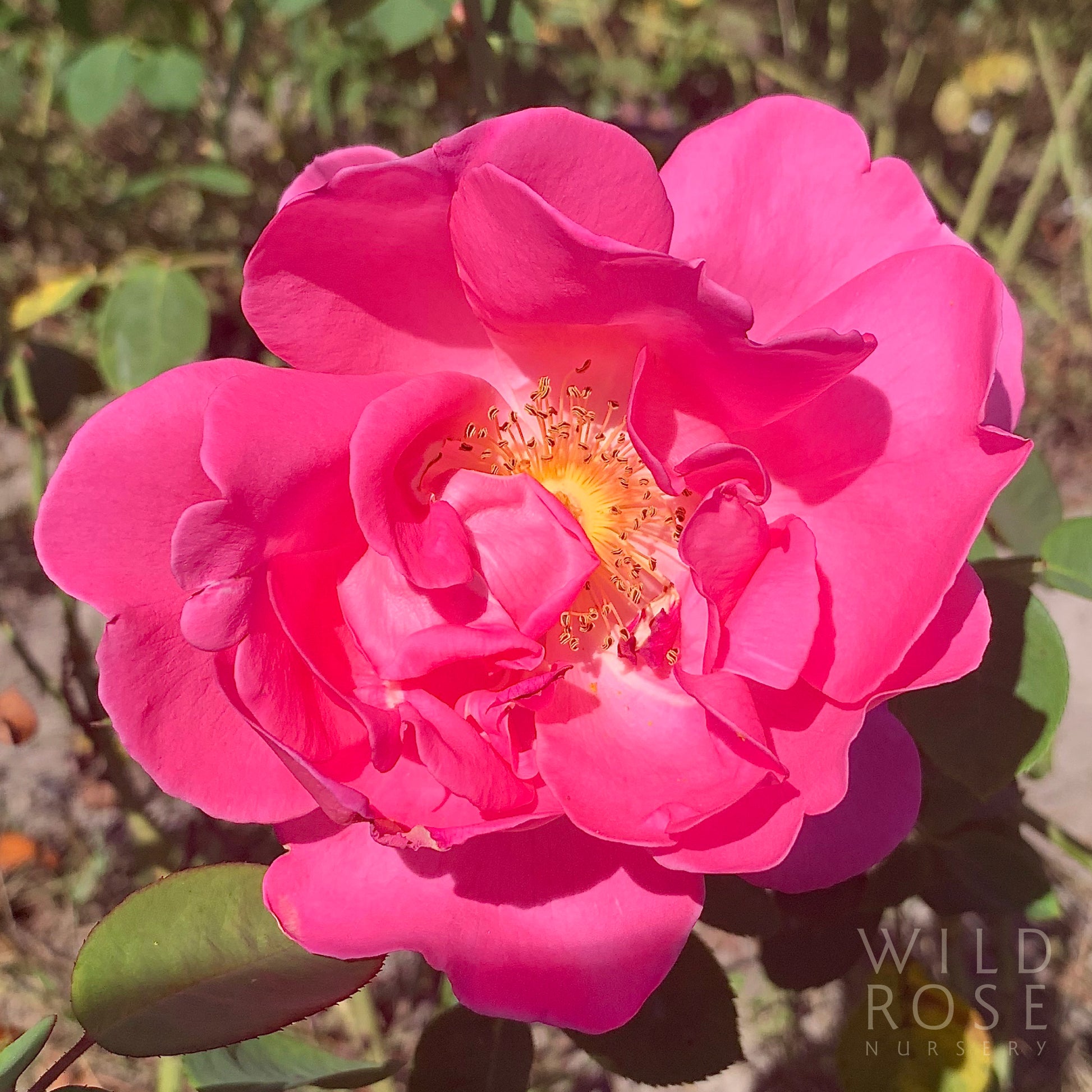 Large, semi-double, borne mostly solitary, cupped, carmine-pink flowers with golden stamens