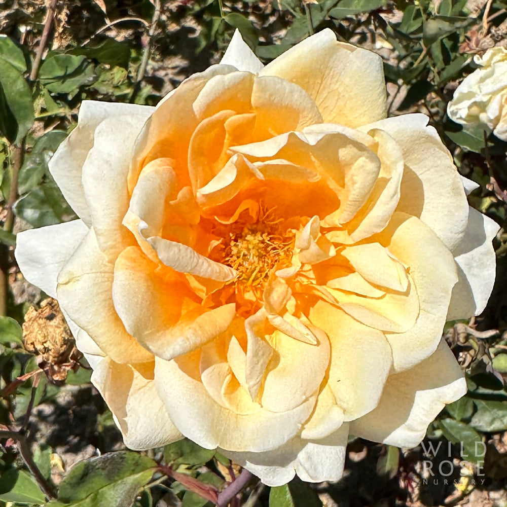 Small clusters of large, semi-double, open cupped, borne mostly solitary, deep apricot-yellow flowers with long, pointed buds