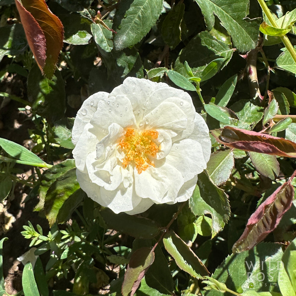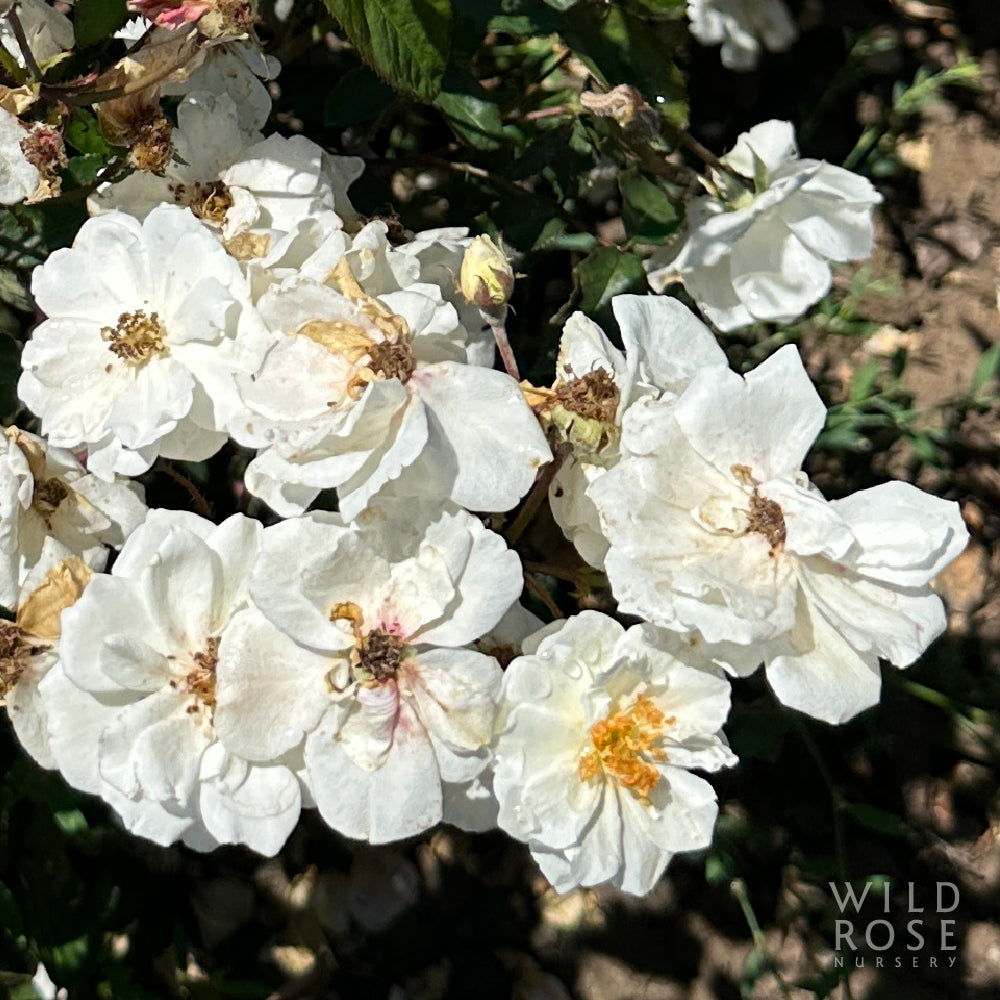 Small clusters of medium, semi-double, creamy white flowers with yellow stamens
