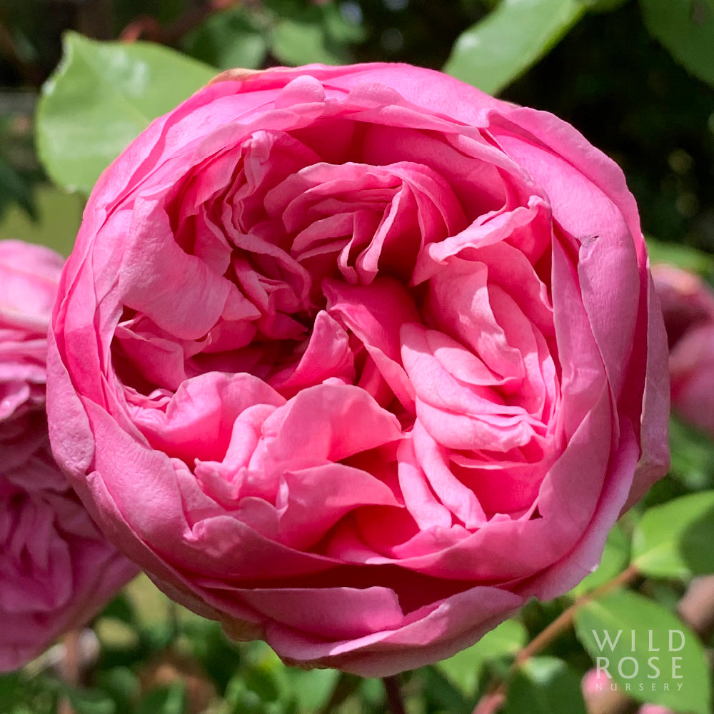 Large, double, cupped, ruffled, deep pink flowers with lighter shading and silvery undertones