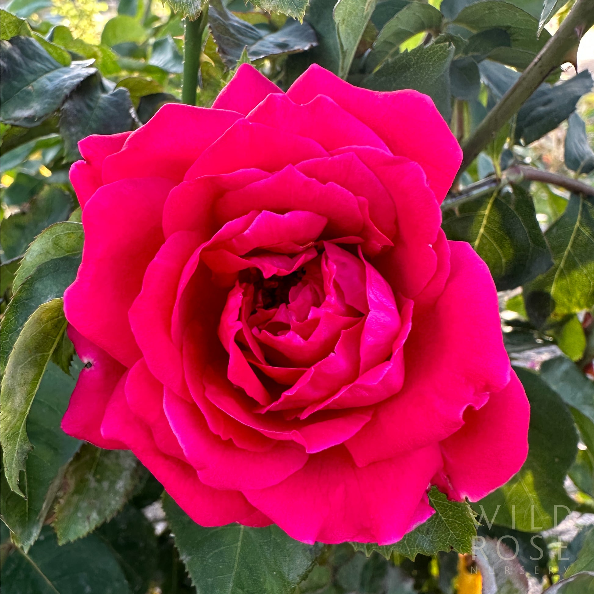Large, double, cupped, deep cherry-red flowers with ovoid buds