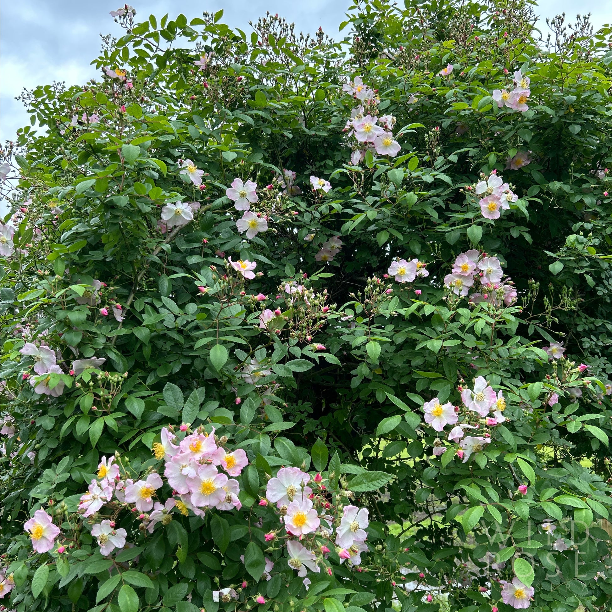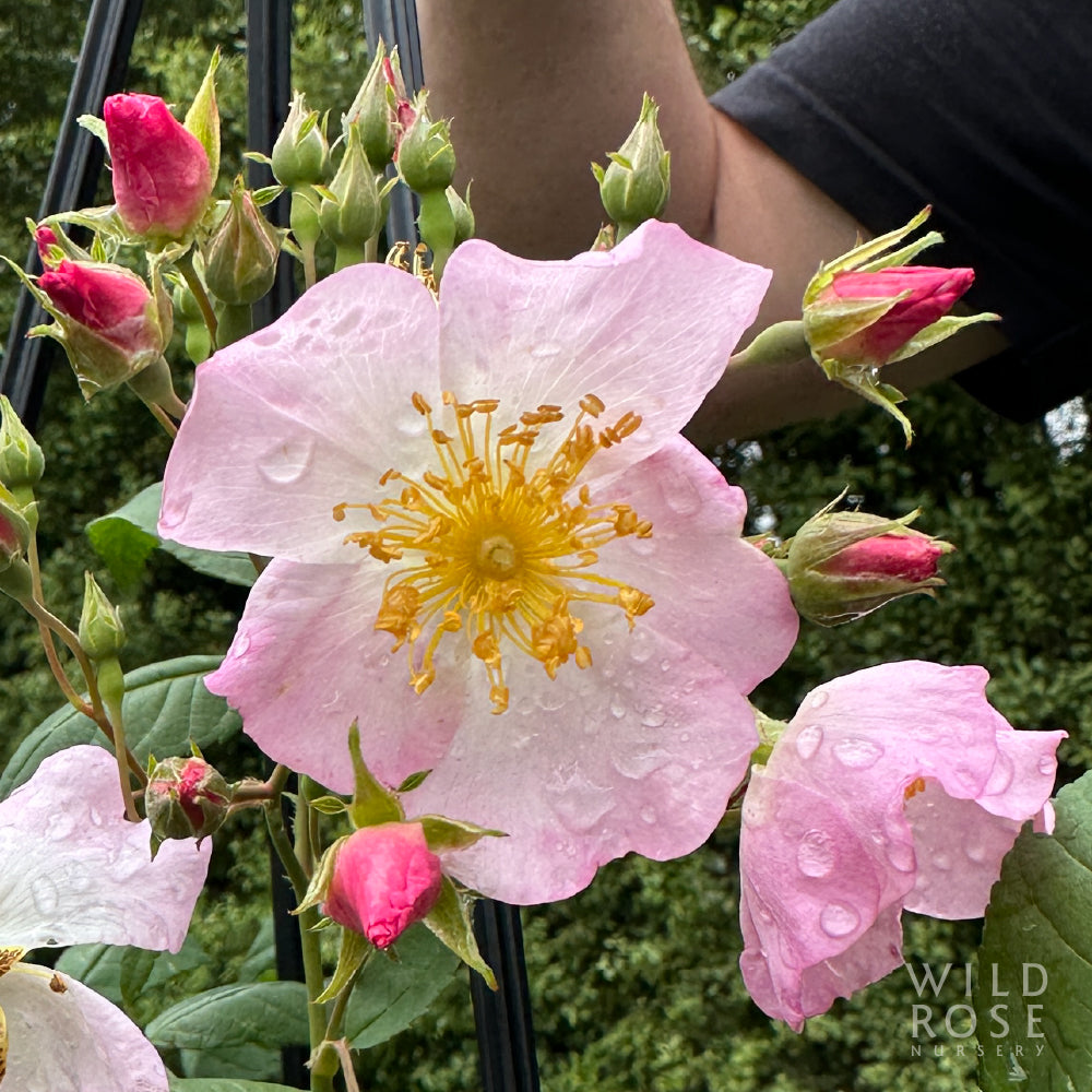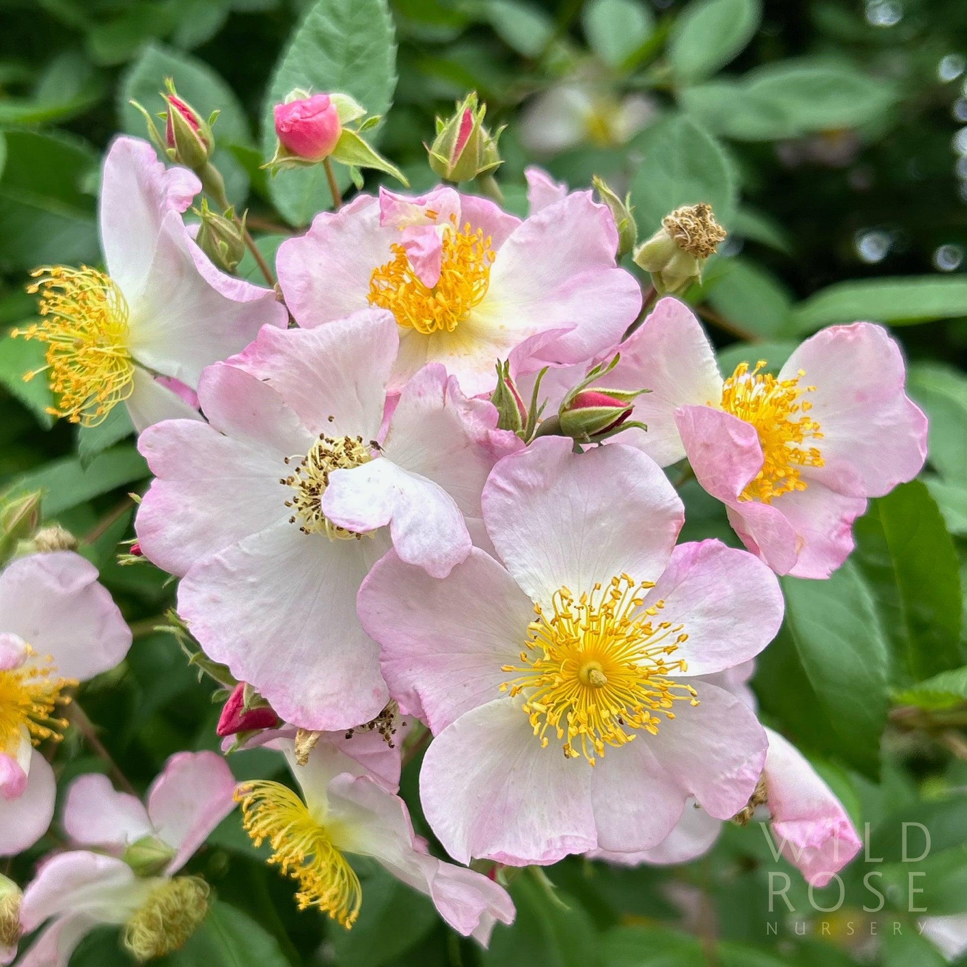Clusters of single, light pink flowers with darker edges and prominent golden stamens
