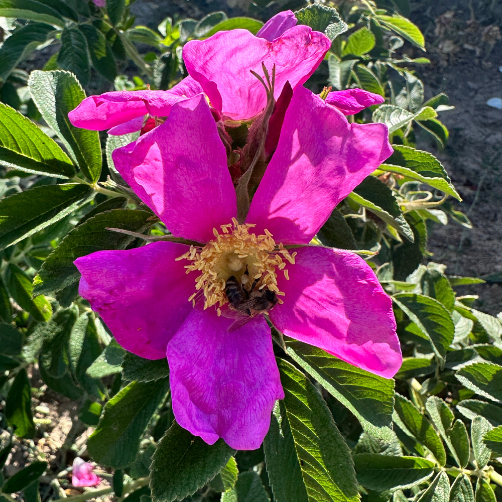 Small clusters of medium, semi-double, flat, borne mostly solitary, magenta to deep pink flowers with golden yellow stamens