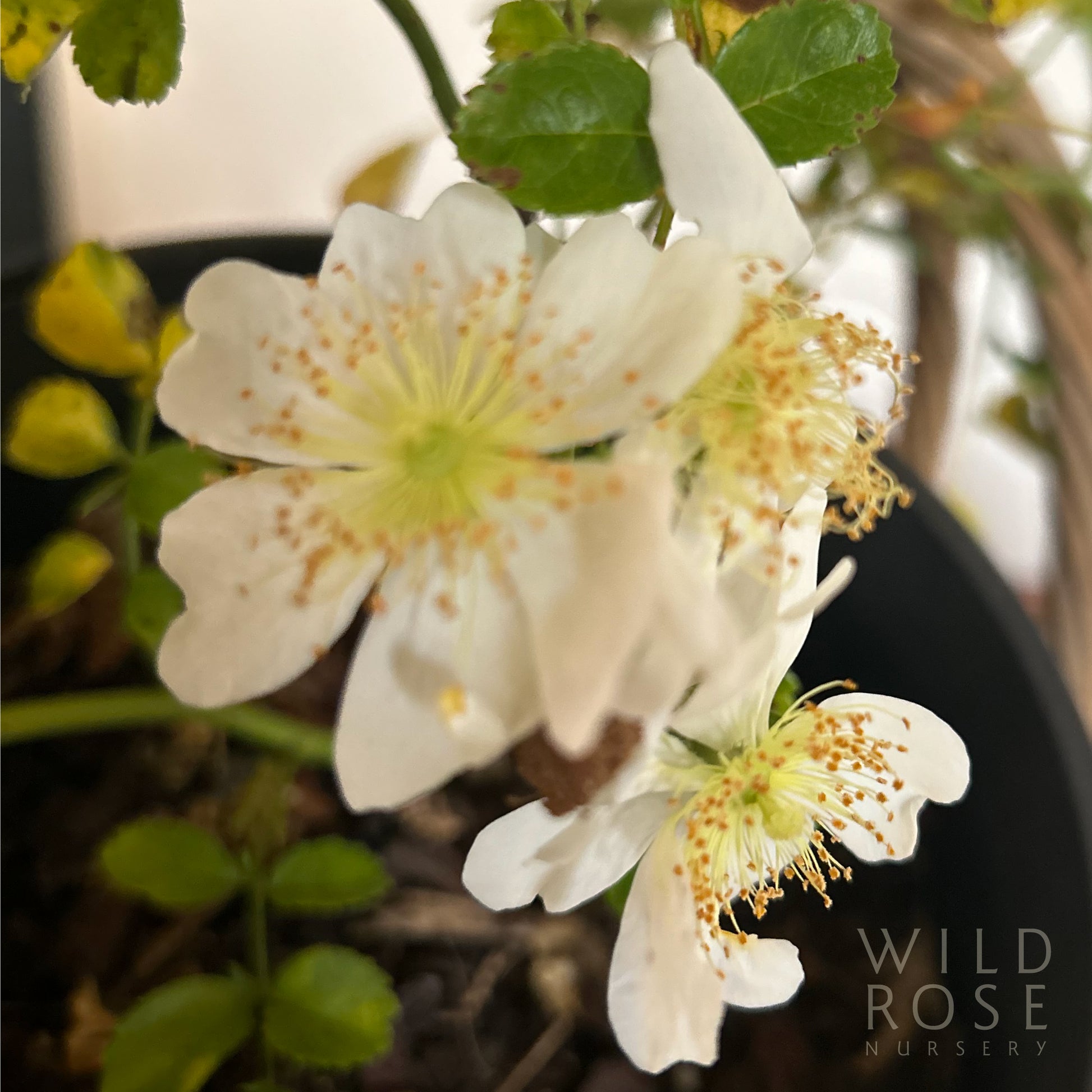 Small, single, white flowers with pink undertones and prominent golden stamens