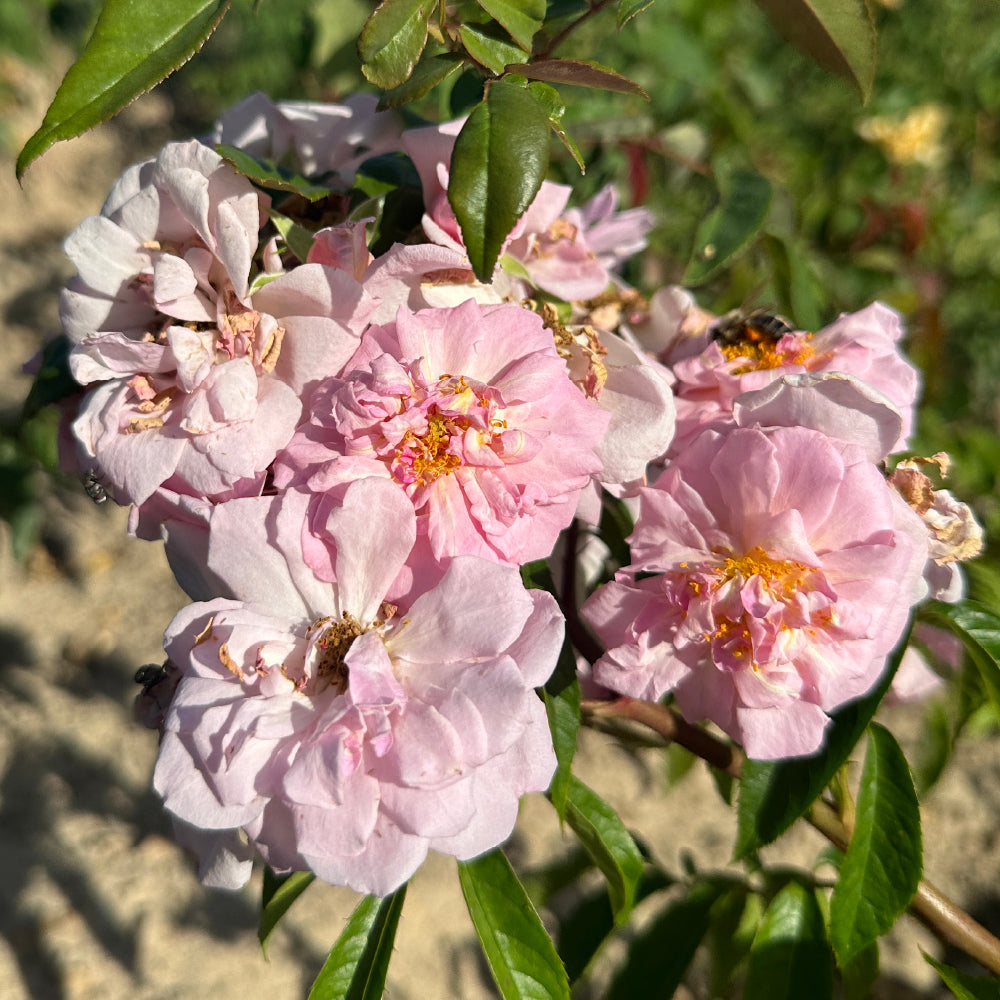 Bushy, upright climber. Near thornless. Excellent as a weeping rose