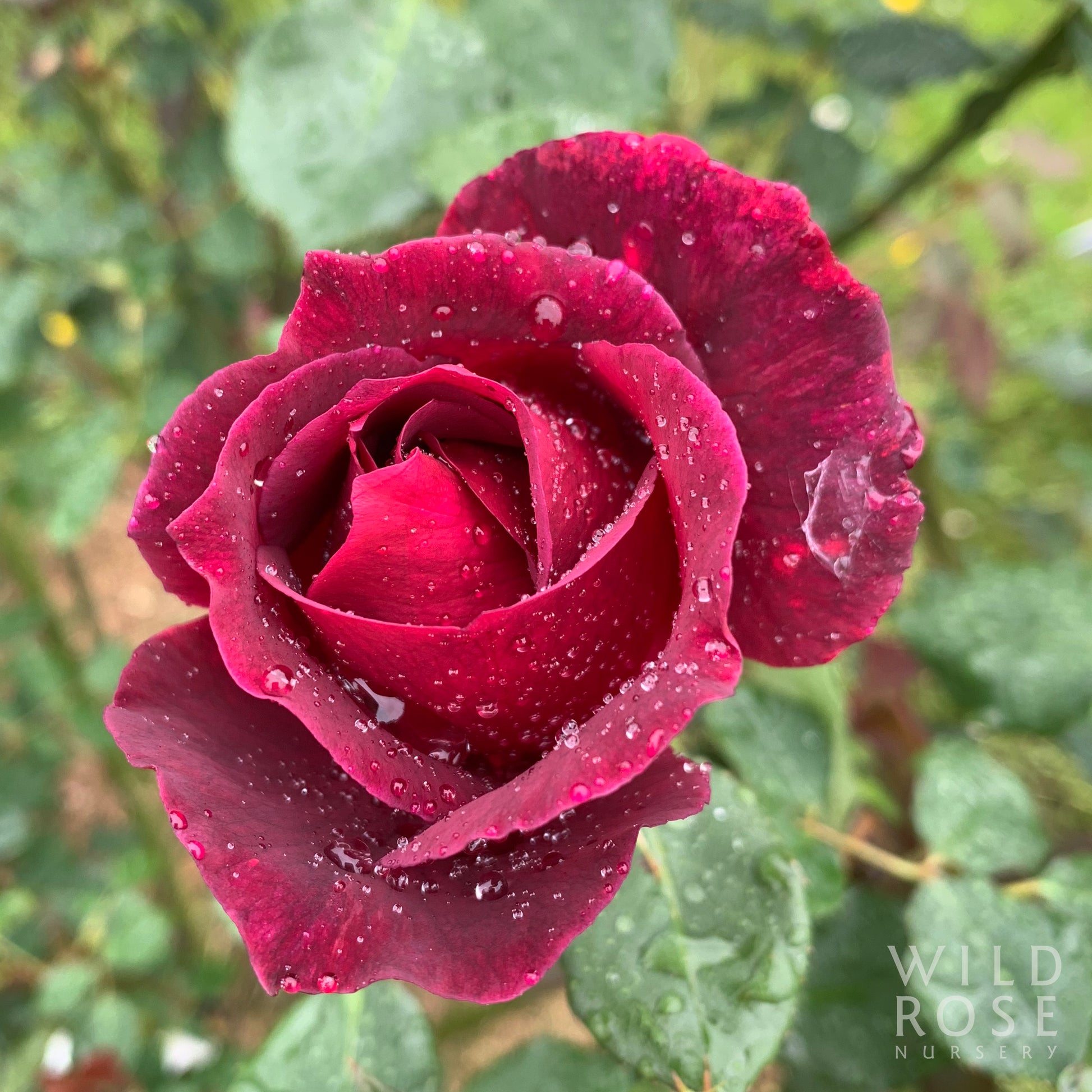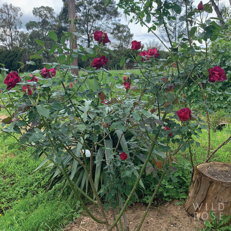 Small clusters of large, semi-double, flat to cupped, dark velvety-crimson flowers