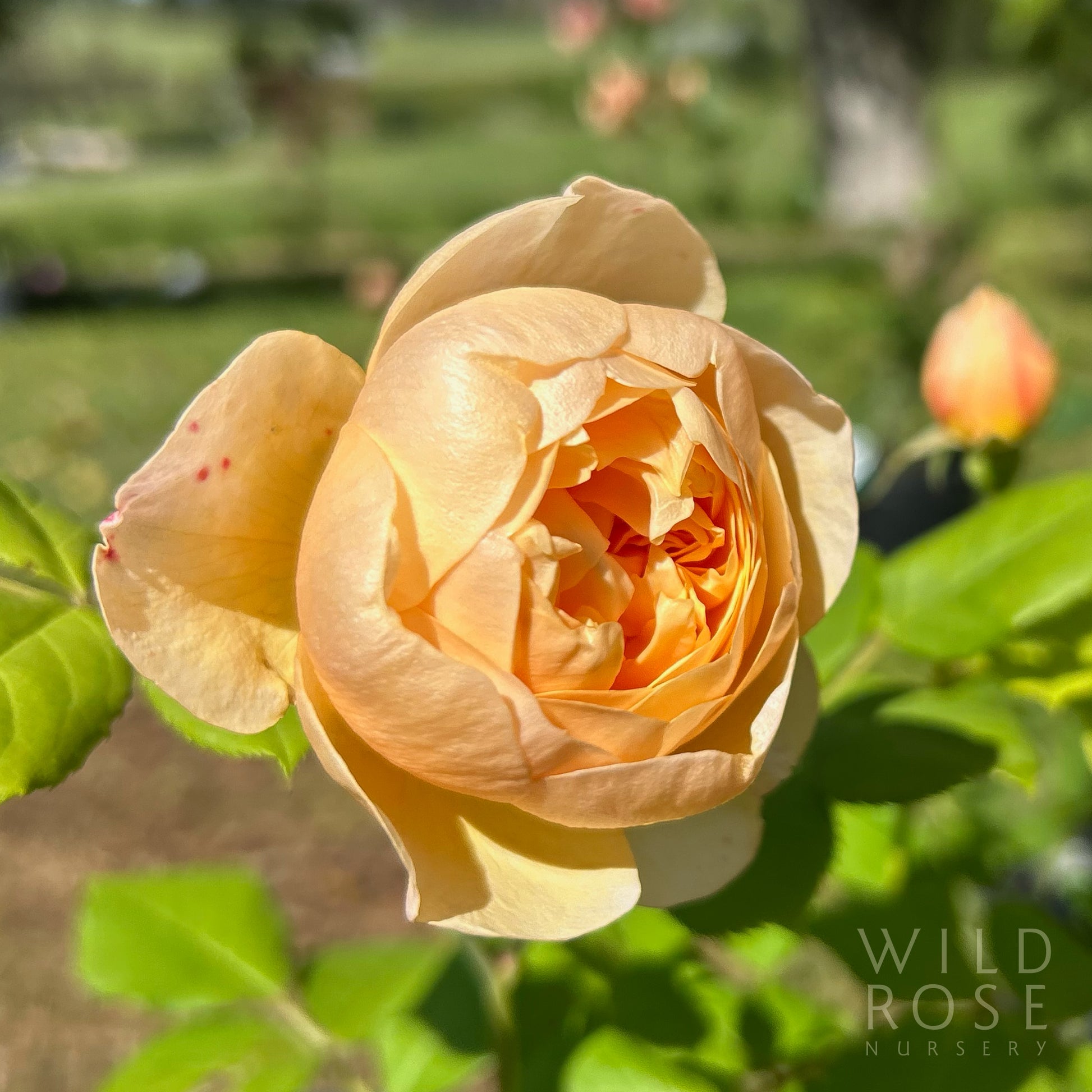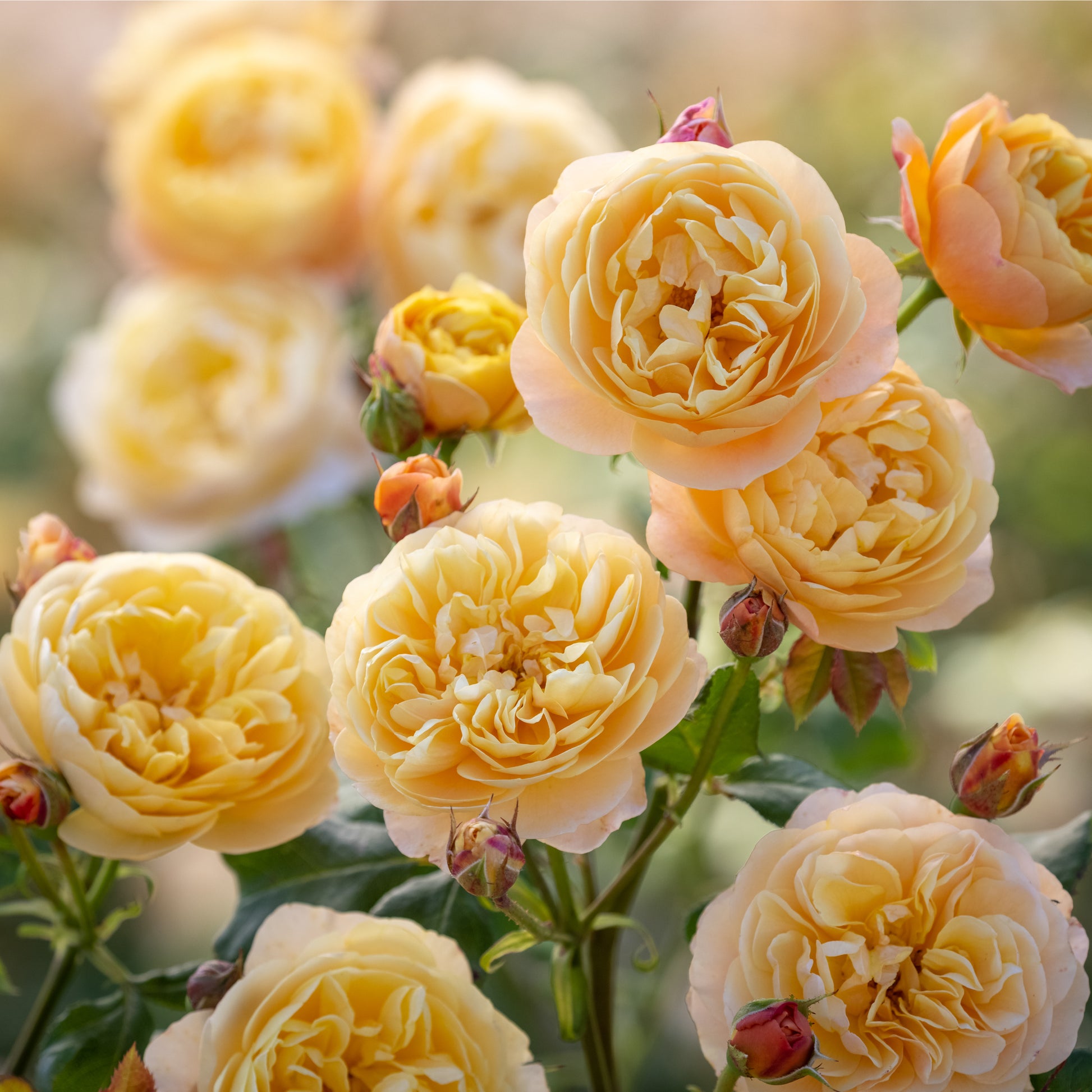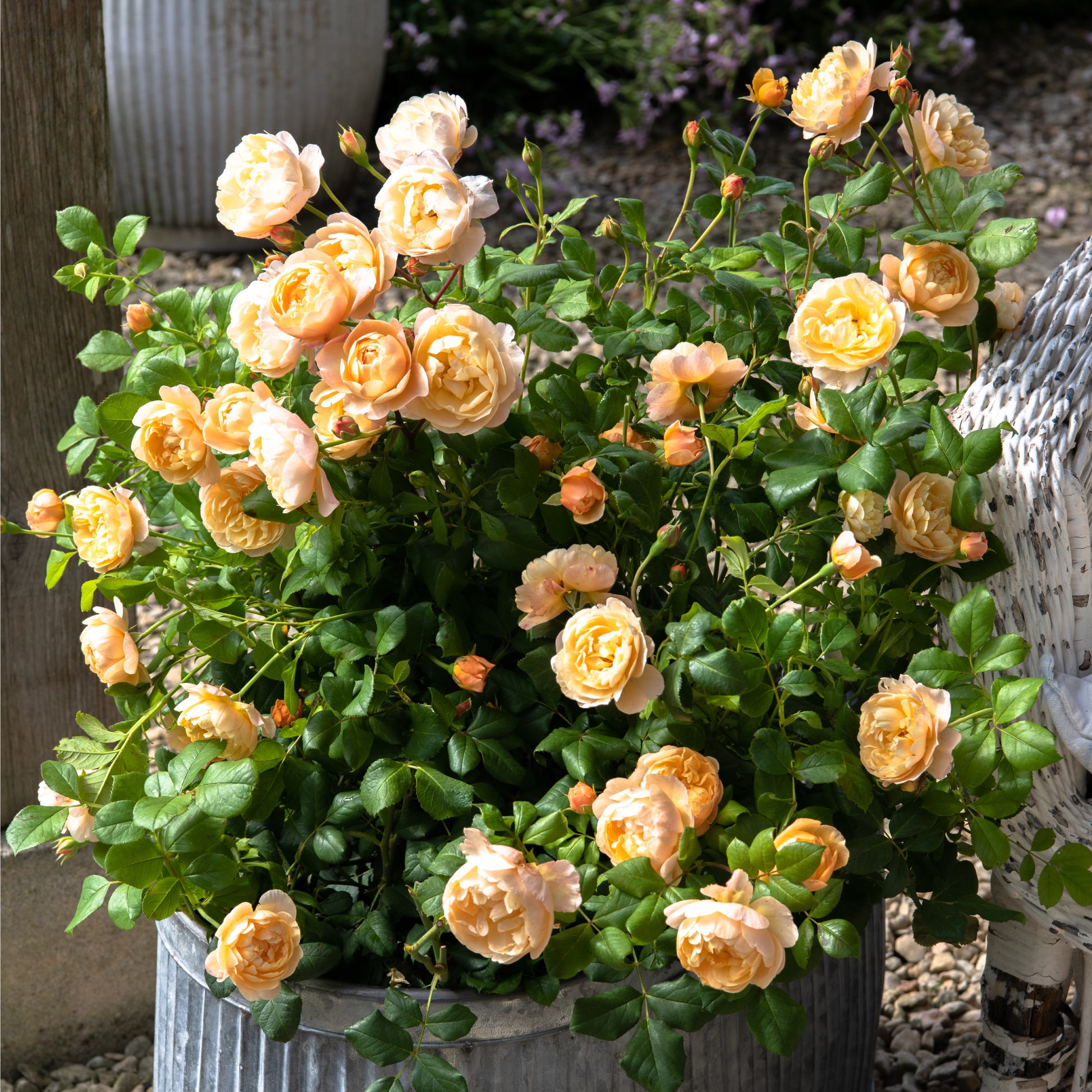 Small clusters of medium, very full, peach flowers with round, pointed buds