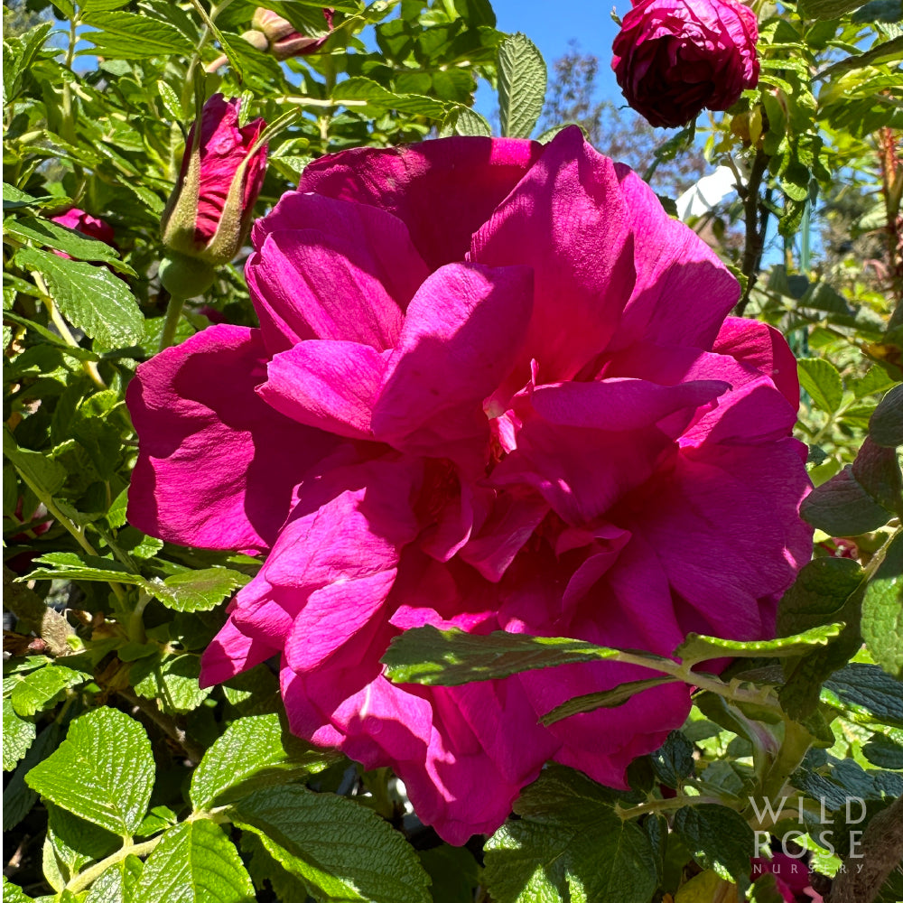 Small clusters of very large, flat, double, borne mostly solitary crimson-purple flowers with contrasting stamens