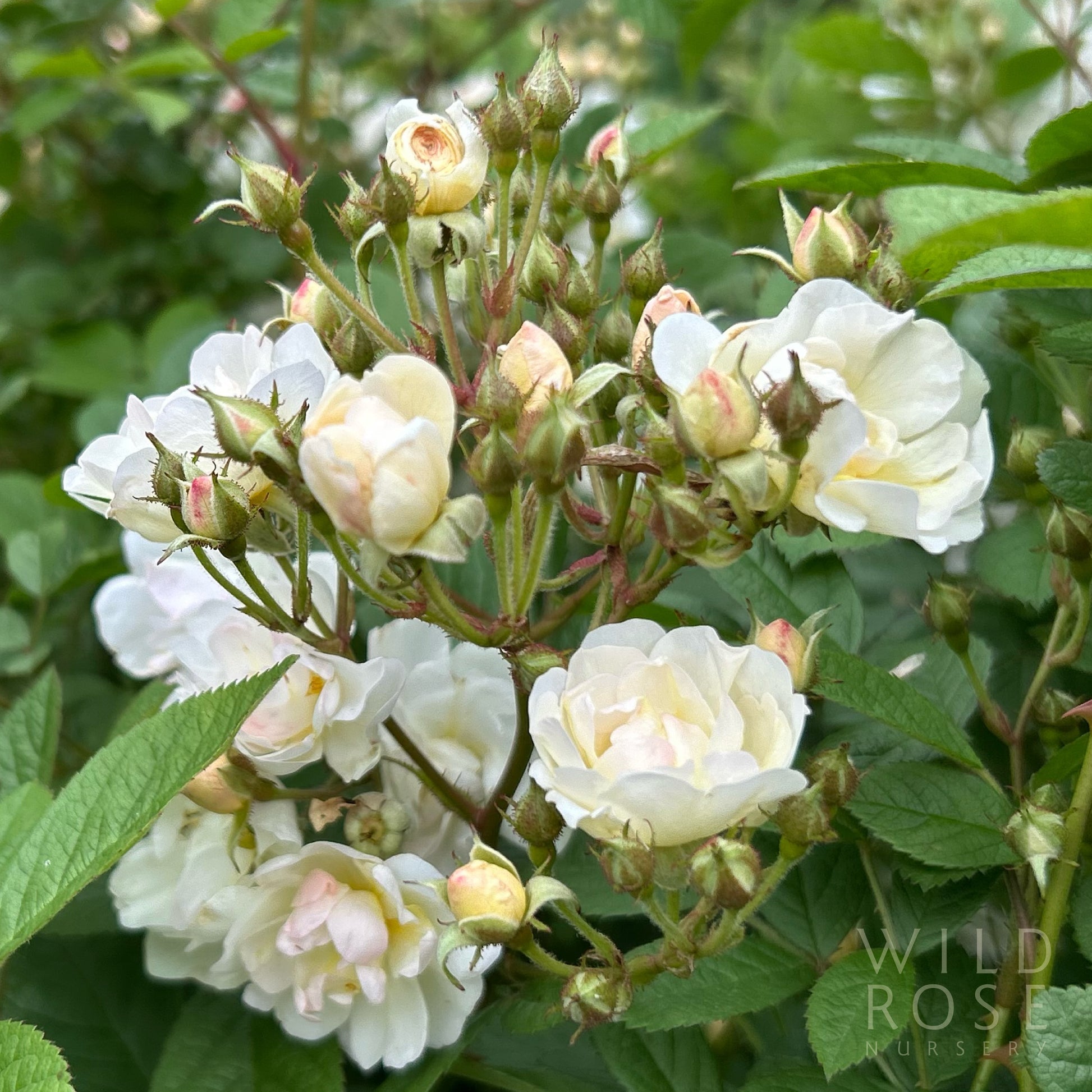 Clusters of small, semi-double, flat, creamy white flowers with salmon-pink edges and golden-yellow stamens