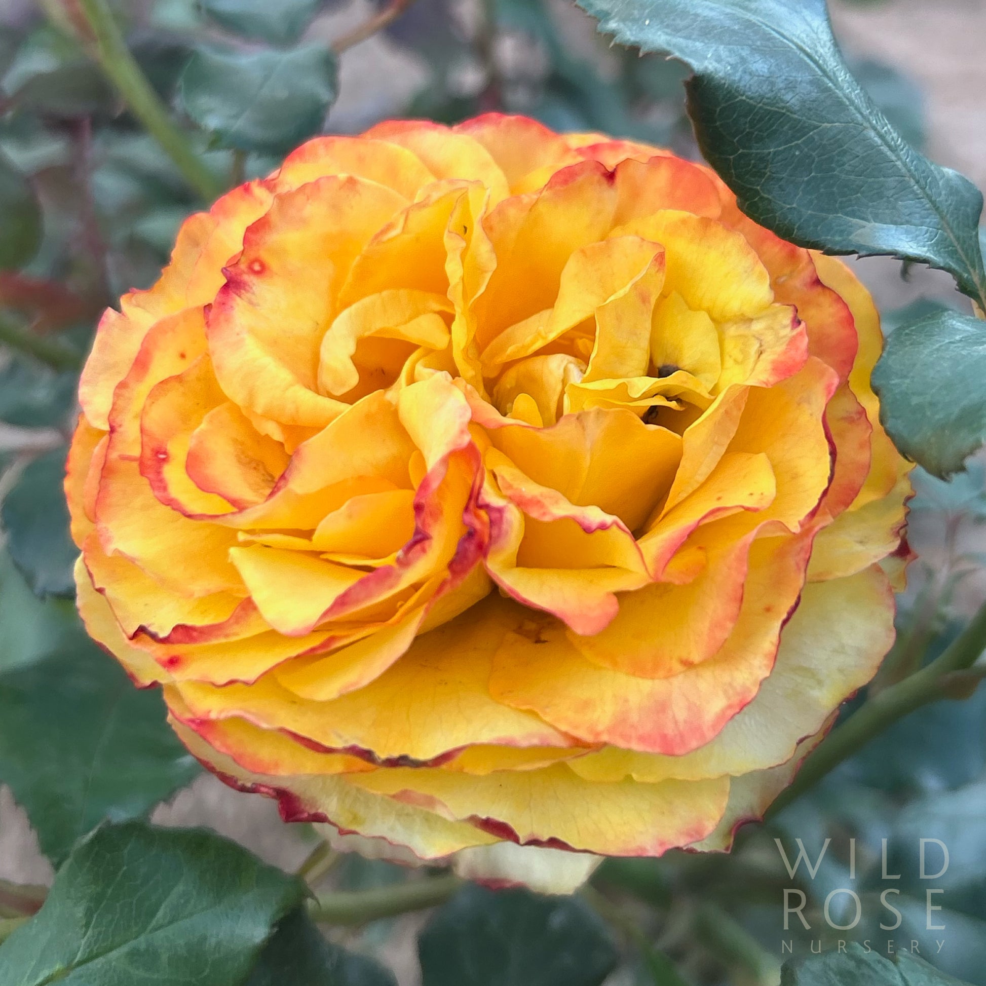 Large, full, cupped, vibrant golden-yellow flowers edged with scarlet red