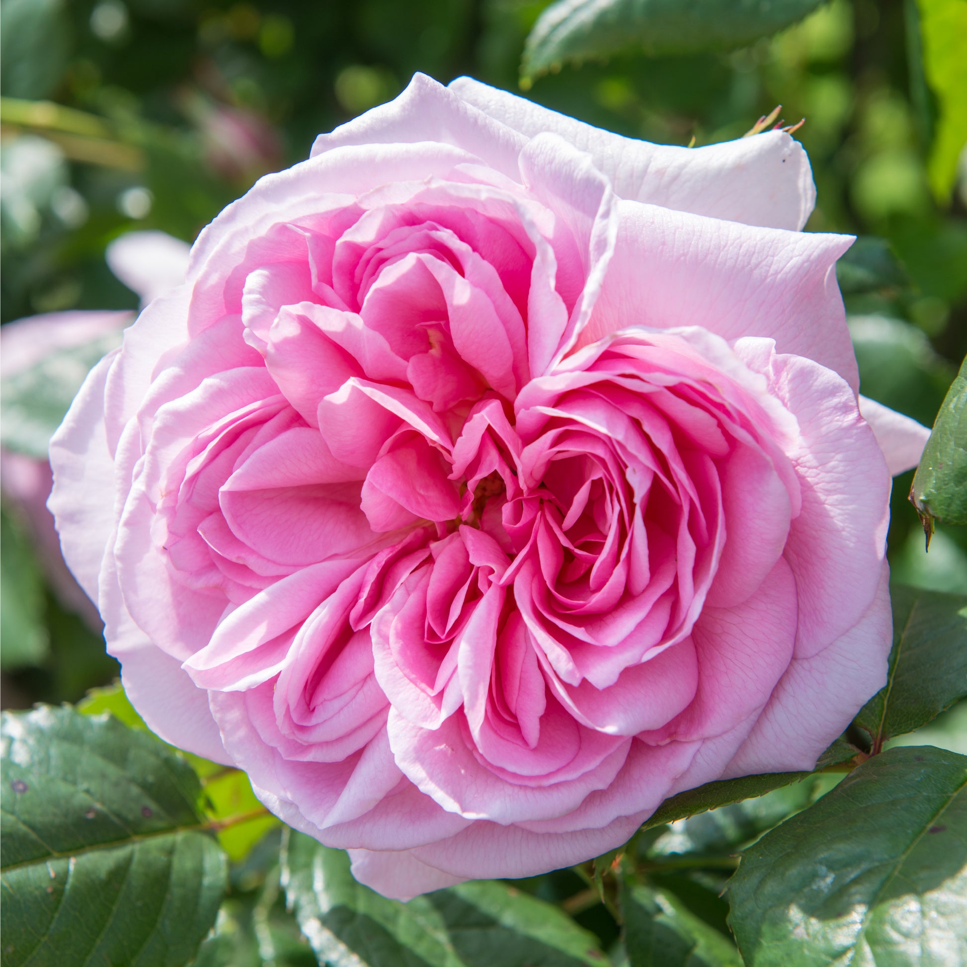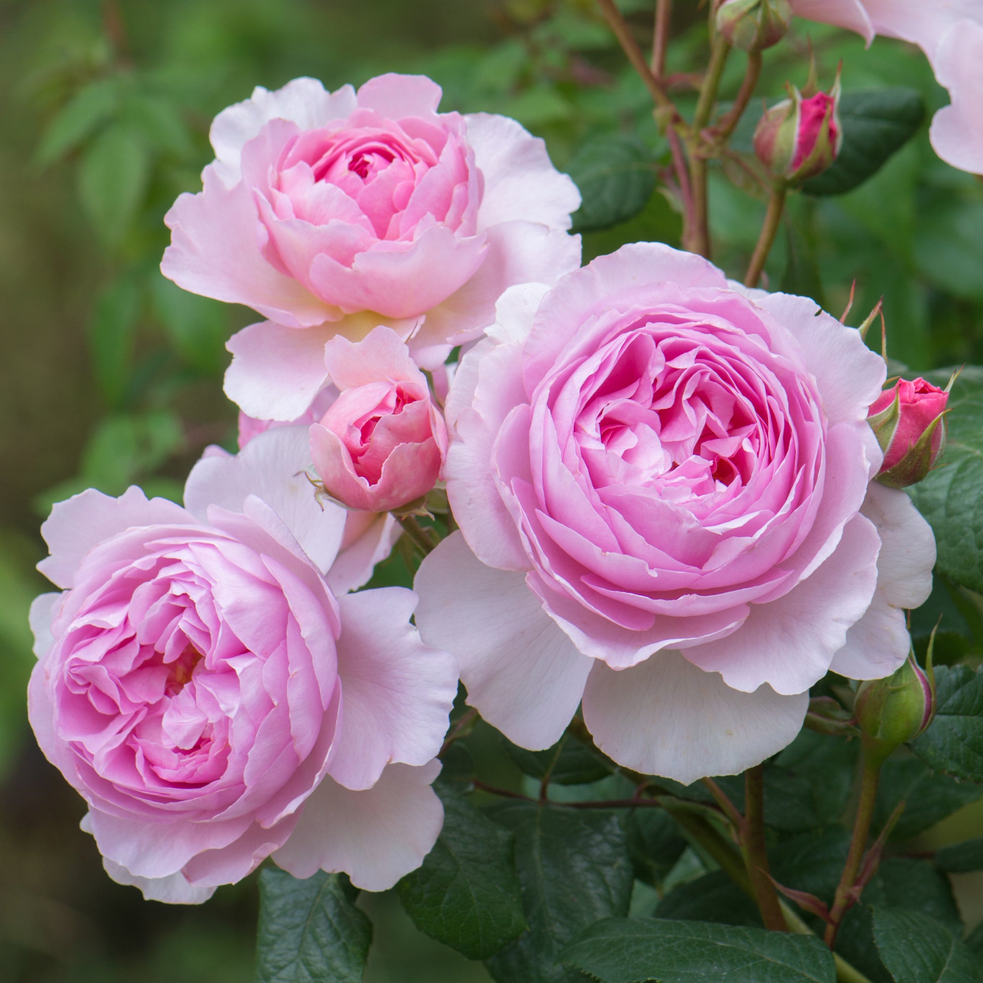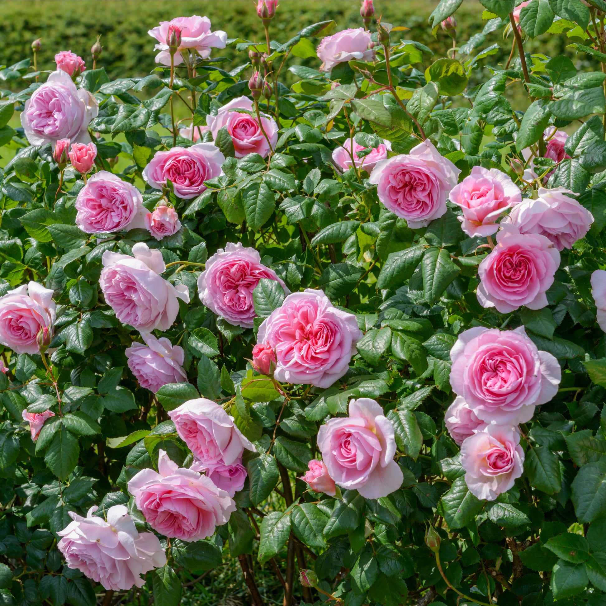 Masses of large, very full, pink blooms with lighter edges and golden stamens