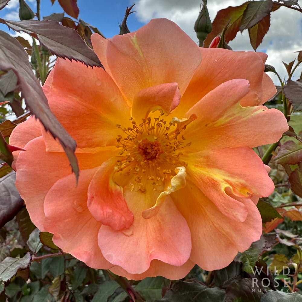 Small clusters of large, double, cupped, ruffled, bright, copper-orange to apricot to gold flowers with ovoid buds
