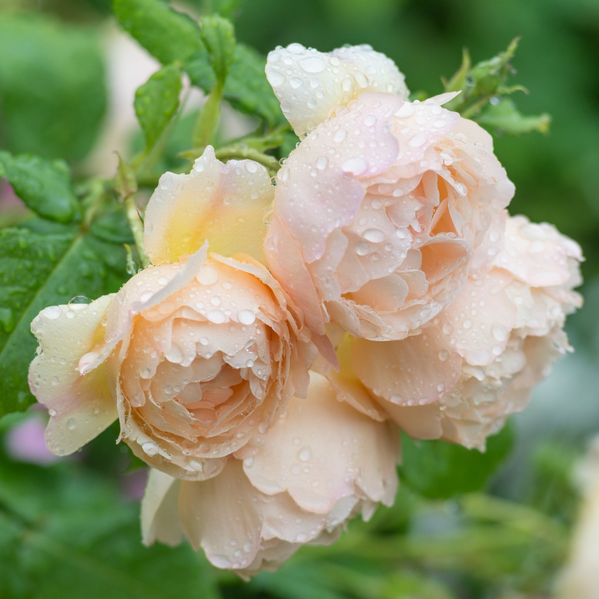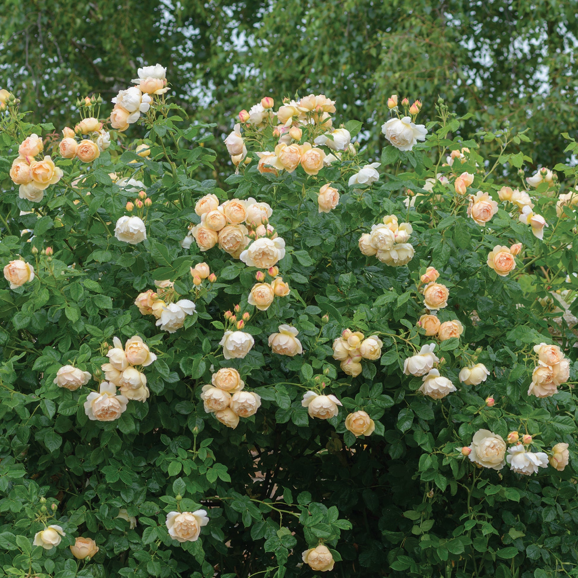 Small clusters of large, very full, rounded, chalice-shaped, pale apricot, buttery-yellow flowers, ageing to lighter with round, pointed buds